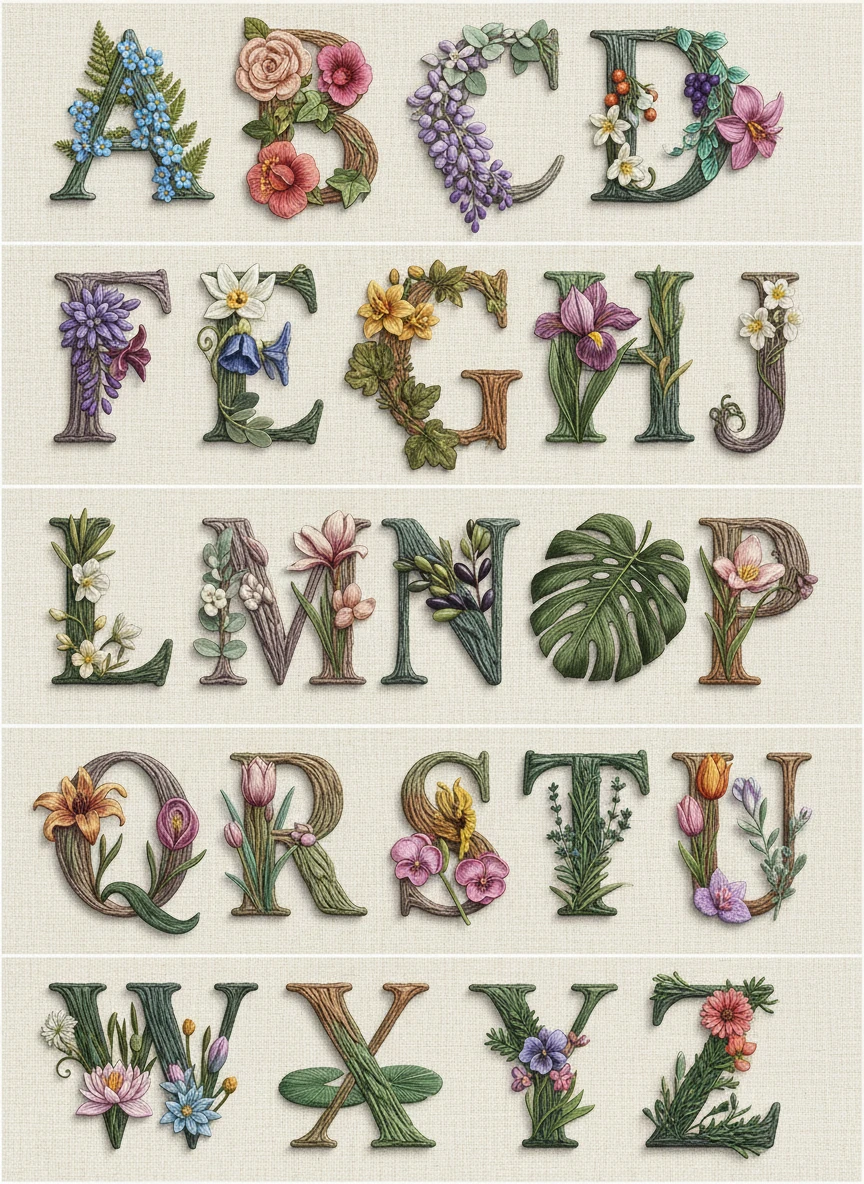 Generate a full alphabet where each letter is adorned with unique flowers and leaves using AI Embroidery Generator. Ensure realistic stitching texture with vibrant, natural colors and fine detailing to make each letter a miniature artwork. Style tags: decorative, detailed, colorful, textured NEG: flat, blurry, cartoon, lowres, messy, oversaturated