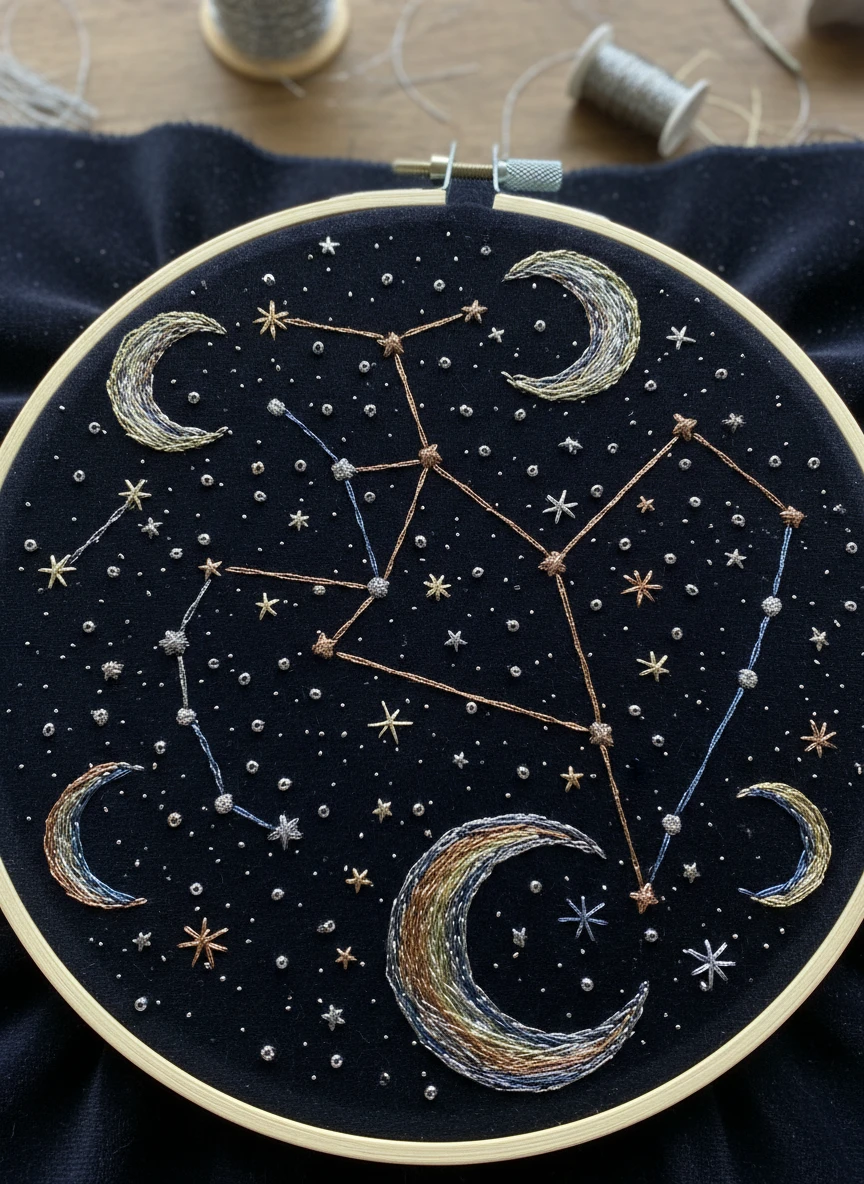 Create a night sky embroidery with AI Embroidery Generator, including stars, moons, and constellations stitched with metallic threads. The design should capture depth and shimmer, with dark velvet-like background fabric. Style tags: celestial, textured, metallic, detailed NEG: flat, blurry, cartoon, lowres, distorted, oversaturated