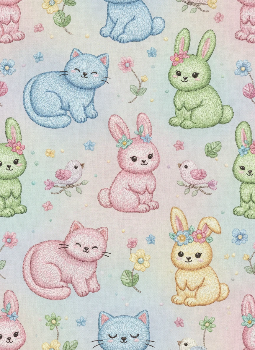 Design a repeating pattern of cute animals like cats, rabbits, and birds using AI Embroidery Generator. Each animal should have soft, plush-like texture created with realistic embroidery stitches and pastel thread colors. Style tags: cute, patterned, textured, pastel NEG: flat, blurry, cartoon, lowres, messy, distorted