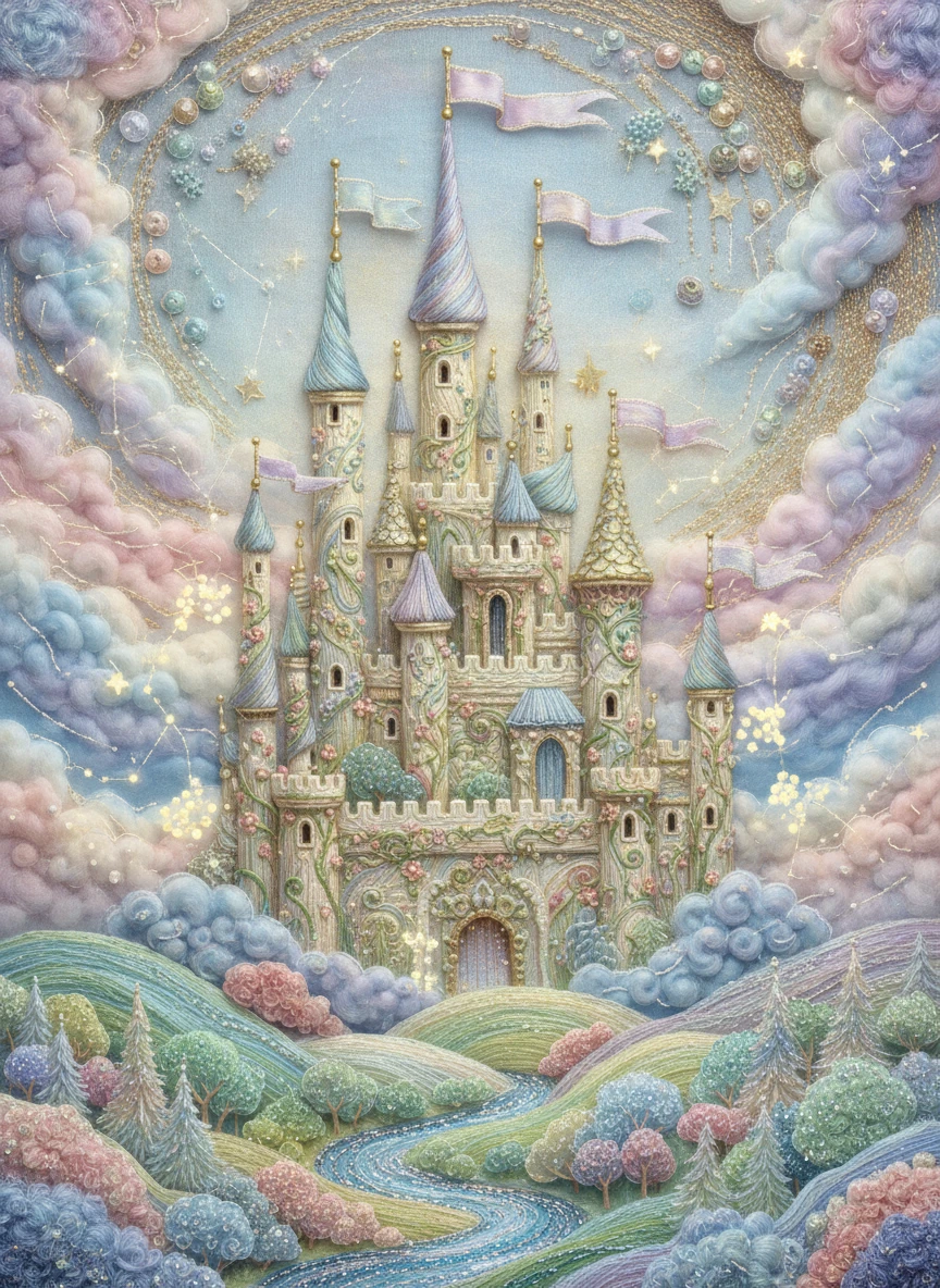 Design a whimsical fairy-tale castle using AI Embroidery Generator, with delicate turrets, flags, and a magical surrounding landscape. Use layered threads to create depth and a soft, dreamy texture, evoking a storybook feel. Style tags: whimsical, textured, pastel, detailed NEG: blurry, pixelated, cartoon, flat, oversaturated, distorted