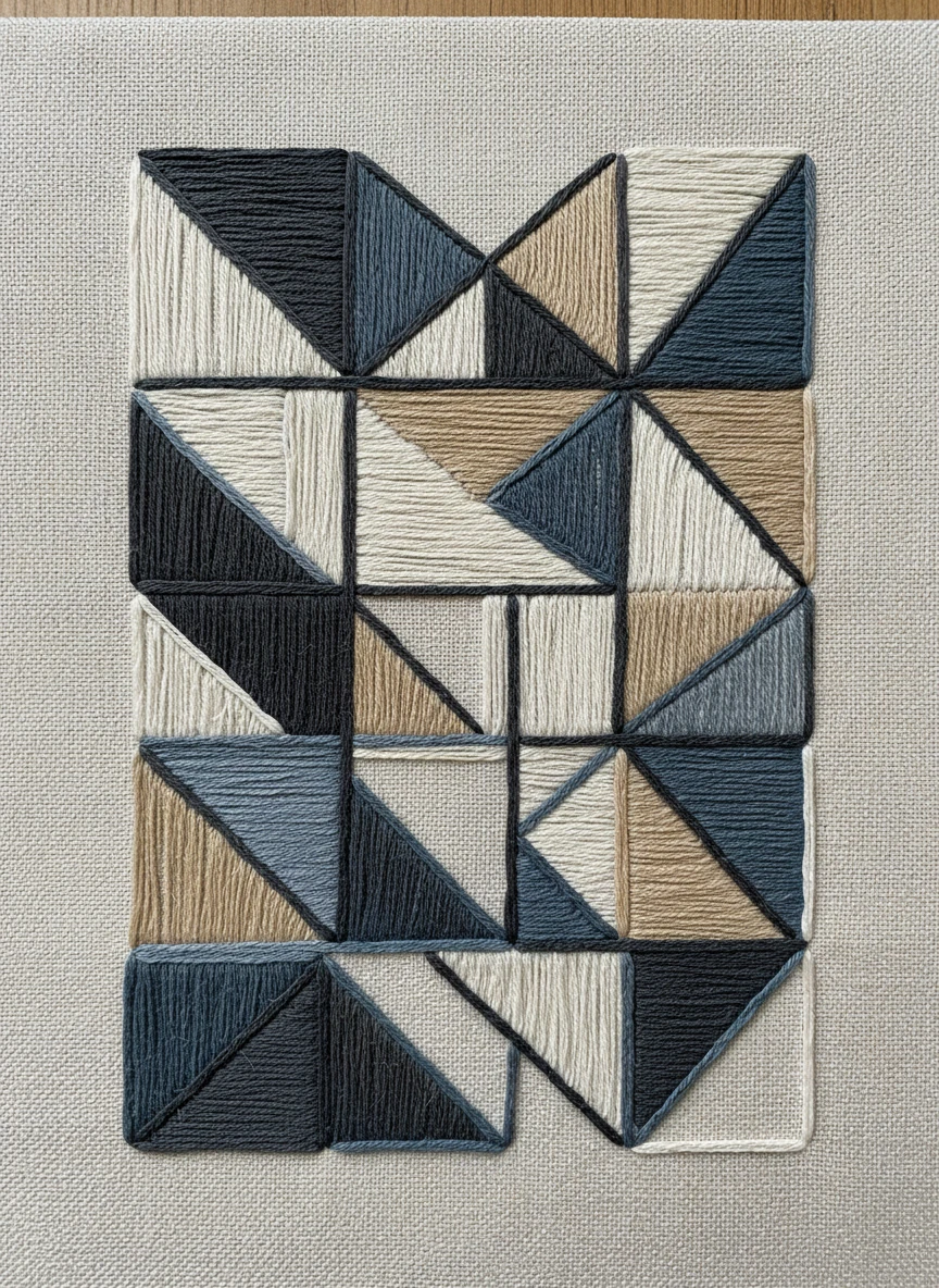 Generate a modern abstract geometric design with AI Embroidery Generator, using sharp shapes, lines, and a minimalist color palette. Stitches should show clear texture and slight layering for a handcrafted look. Style tags: modern, geometric, textured, minimalist NEG: blurry, cartoon, pixelated, flat, oversaturated, messy