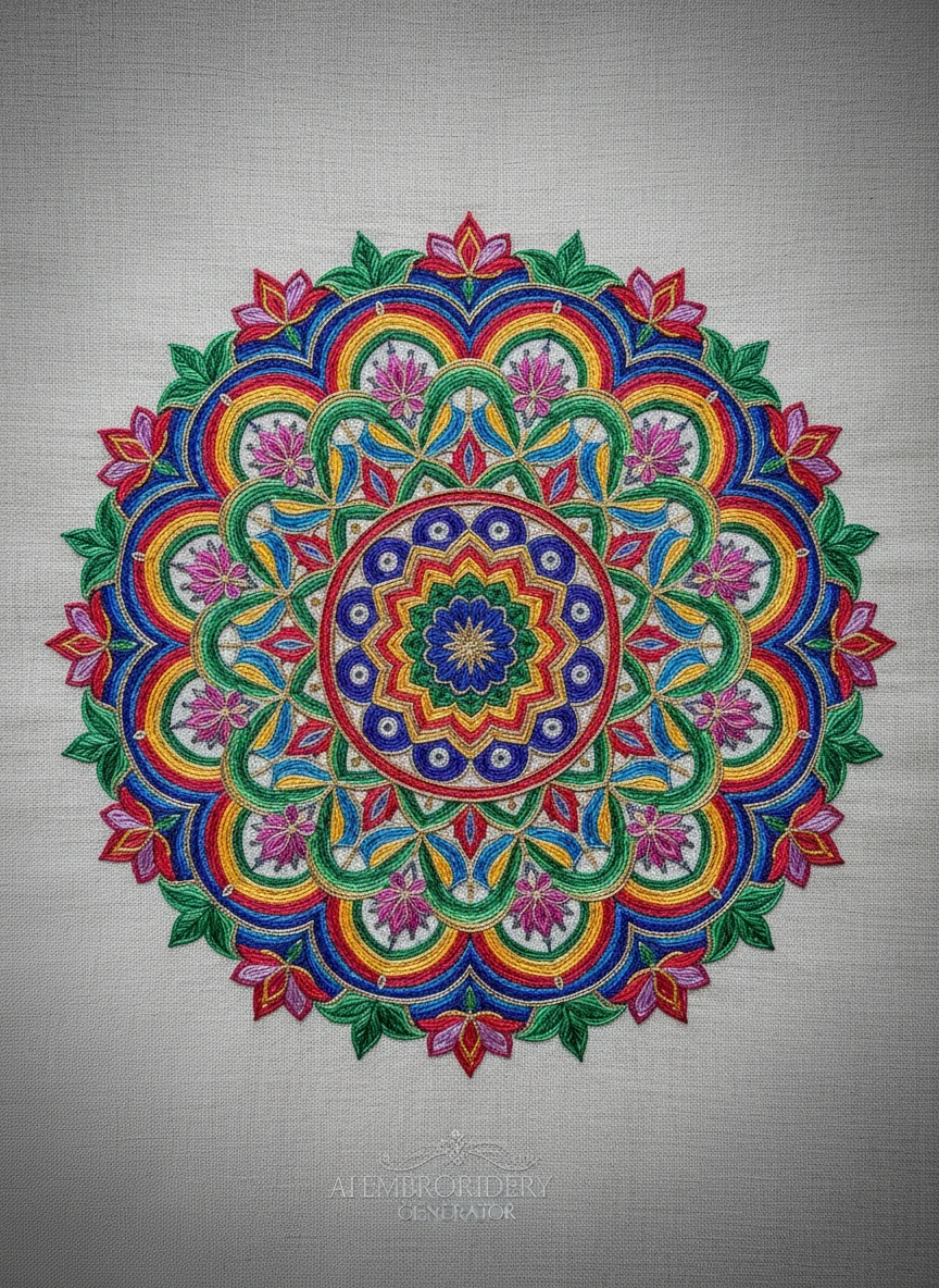 Generate a circular mandala with AI Embroidery Generator, combining geometric patterns and floral motifs in a symmetrical design. Use vibrant yet harmonious thread colors, emphasizing the tactile, raised texture of embroidery stitches. The piece should feel balanced and meditative. Style tags: symmetrical, vibrant, textured, intricate NEG: flat, blurry, cartoon, lowres, messy, distorted