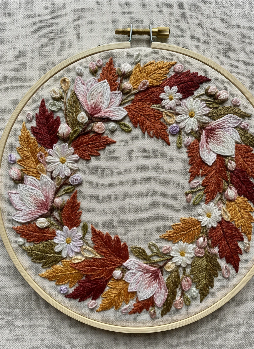 Create a seasonal wreath, like autumn leaves or spring blossoms, using AI Embroidery Generator. Threads should vary subtly in color and thickness to highlight texture and natural variation, giving a realistic stitched effect. Style tags: seasonal, textured, colorful, detailed NEG: flat, blurry, cartoon, lowres, oversaturated, distorted