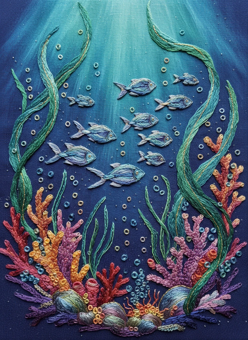 Create an underwater ocean scene using AI Embroidery Generator, featuring fish, corals, and seaweed in soft, flowing stitch patterns. Threads should blend colors smoothly to capture movement and depth, with subtle highlights to mimic light through water. Style tags: aquatic, textured, colorful, realistic NEG: flat, pixelated, cartoon, messy, lowres, oversaturated