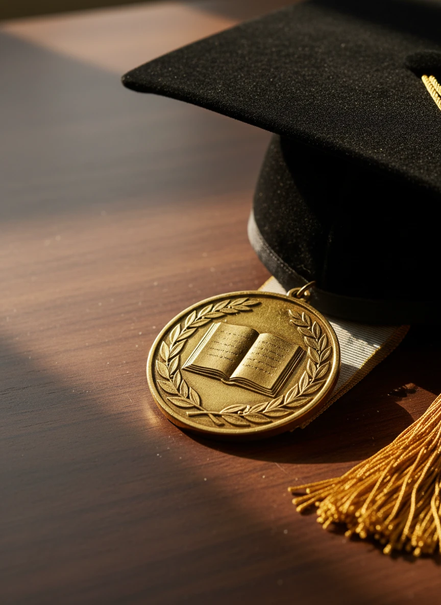 A highly realistic academic achievement medal made of antique gold, engraved with an open book and laurel branches. The medal lies on a dark wooden desk beside a graduation cap. Natural lighting emphasizes engraved depth, realistic metal wear, and premium finish. photorealistic, warm tones — NEG: flat, cartoonish, low-res
