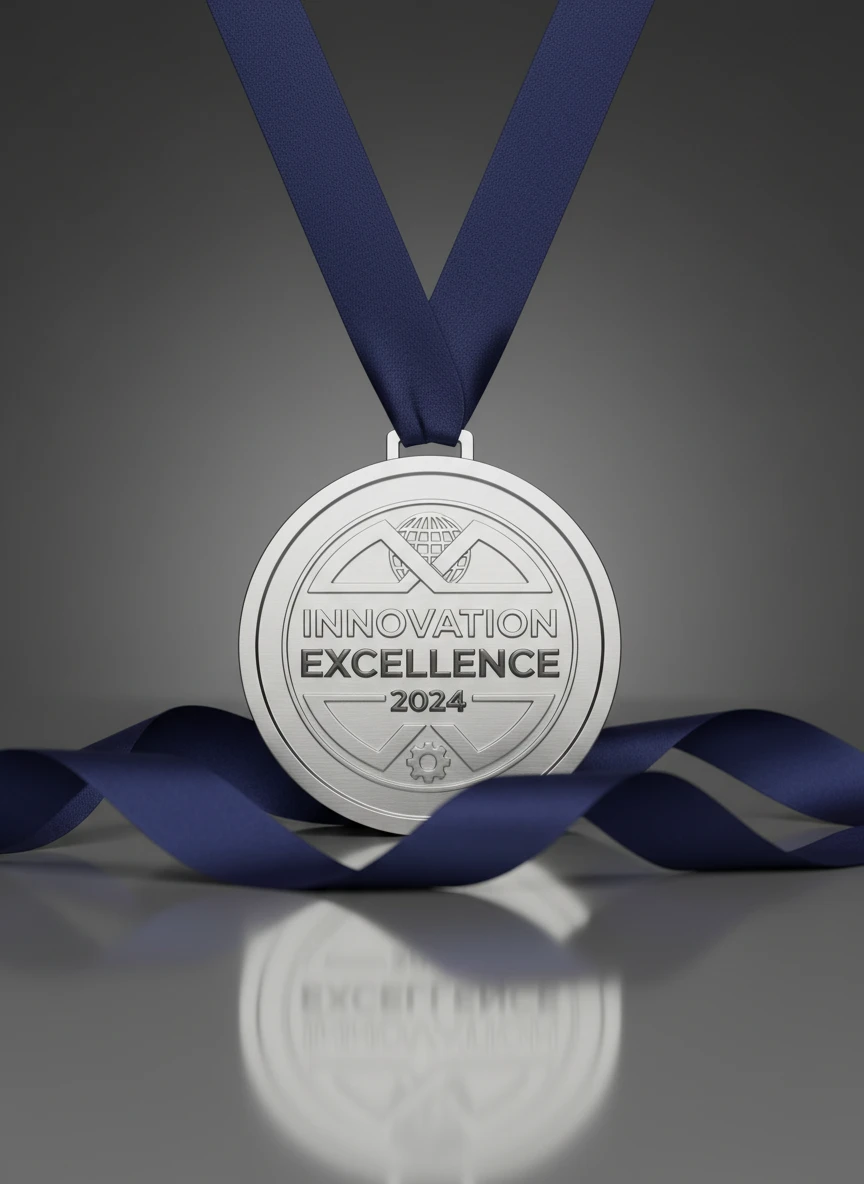 A premium corporate award medal designed using AI Medal Generator, with a sleek engraved title on a platinum-finish surface. The navy blue silk ribbon is photographed in a clean professional studio setting. Subtle reflections enhance a high-end brand aesthetic. Style tags: corporate, premium, professional. NEG: casual style, uneven engraving, low contrast, background clutter, distortion, grain.