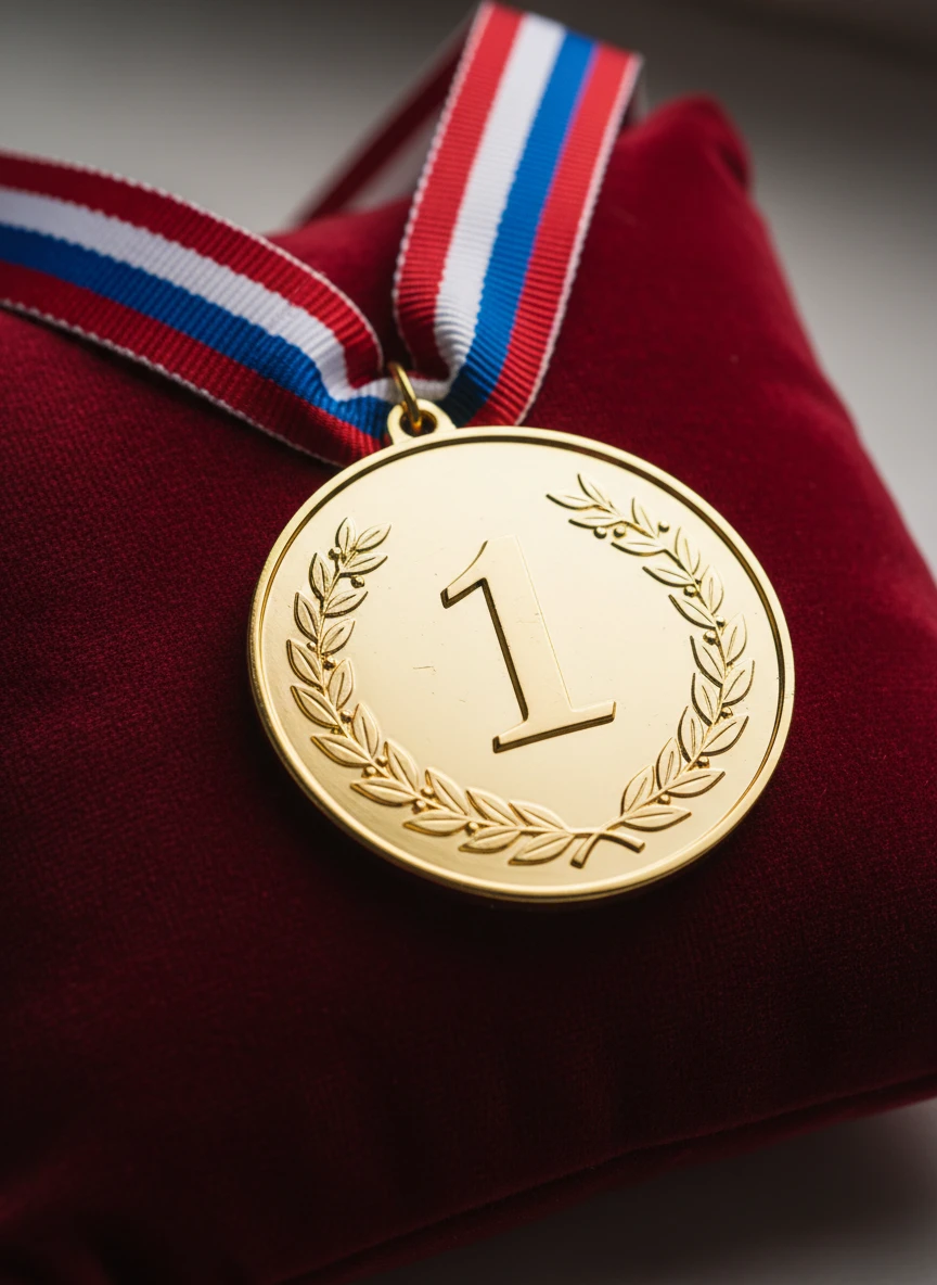 A hyper-realistic gold championship medal resting on a rich red velvet cushion, engraved laurel wreath border with a bold number “1” at the center. The medal has a polished metallic shine, fine engraved details, and a thick red-white-blue ribbon attached. Studio lighting highlights realistic reflections, scratches, and weight. ultra-realistic, macro detail, cinematic lighting — NEG: cartoon, plastic, blurry, low detail