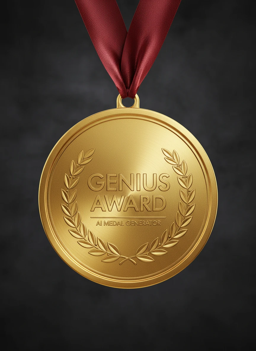 A luxurious gold award medal designed by AI Medal Generator, featuring a bold engraved title centered within a detailed laurel wreath. The medal hangs from a deep red satin ribbon, captured under dramatic studio lighting that highlights realistic metallic reflections. Ultra-fine engraving depth and premium craftsmanship are clearly visible. Style tags: photorealistic, luxury, studio-lighting. NEG: blurry, low-detail, flat design, misspelled text, warped metal, noise, artifacts.