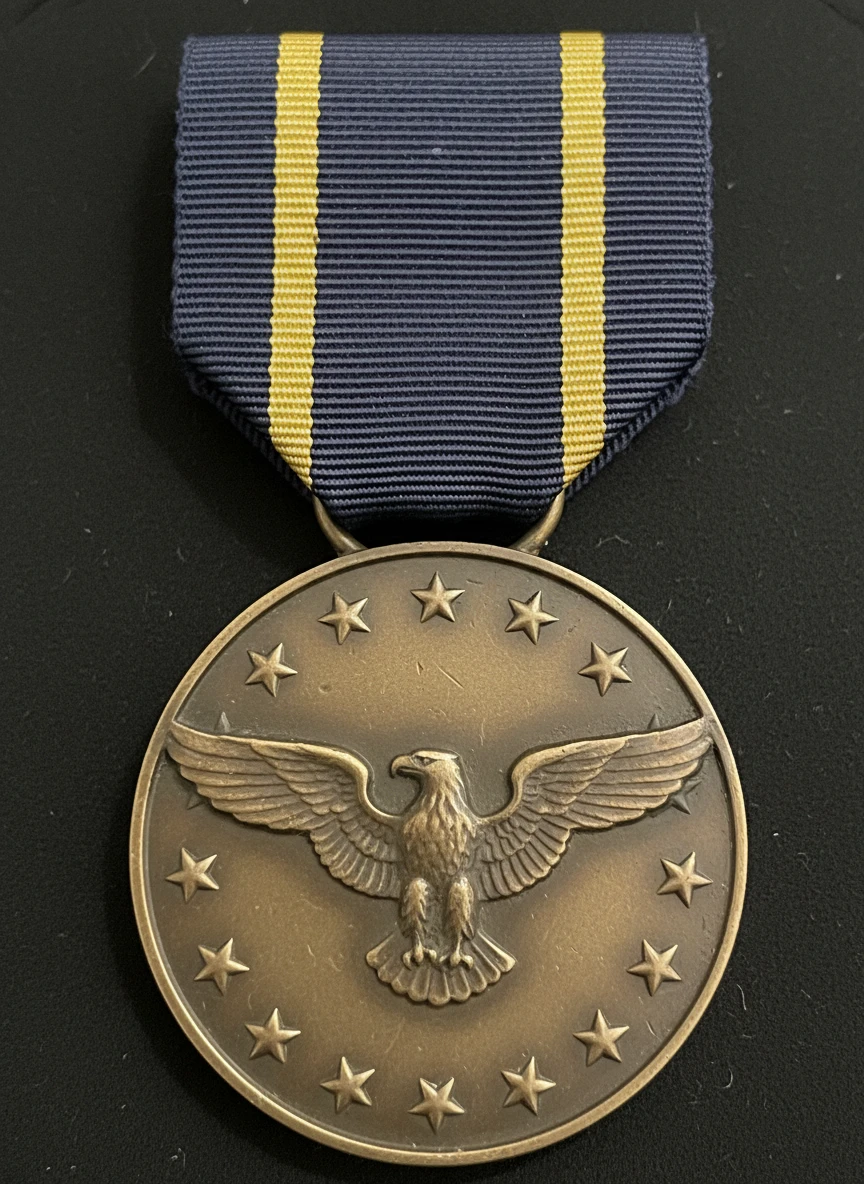 A photorealistic military service medal made of brushed bronze with an embossed eagle insignia and star pattern. The medal hangs from a dark blue ribbon with gold stripes, showing realistic fabric texture and metal aging. Soft dramatic lighting, shallow depth of field, authentic military craftsmanship. ultra-detailed, realistic metal texture — NEG: fantasy, glossy plastic, illustration