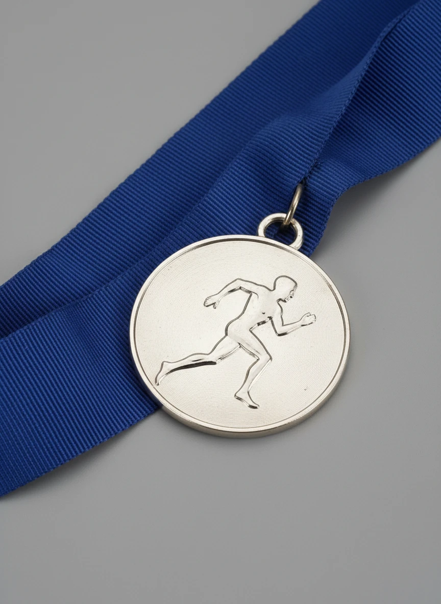 A realistic silver athletic medal displayed on a neutral gray background, featuring an engraved athlete silhouette and subtle circular texture lines. The silver surface shows natural reflections and minor imperfections. Attached is a blue ribbon with woven fabric detail. studio realism, high resolution, professional product photography — NEG: CGI look, fake shine, blur