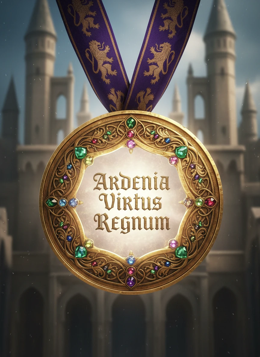 A fantasy kingdom honor medal designed through AI Medal Generator, featuring an ornate engraved title framed by jeweled filigree. The medal emits a soft magical glow and hangs from a royal purple ribbon. Rich textures and cinematic lighting create an epic atmosphere. Style tags: fantasy, ornate, cinematic. NEG: flat lighting, modern symbols, messy details, text artifacts, oversaturation, low clarity.