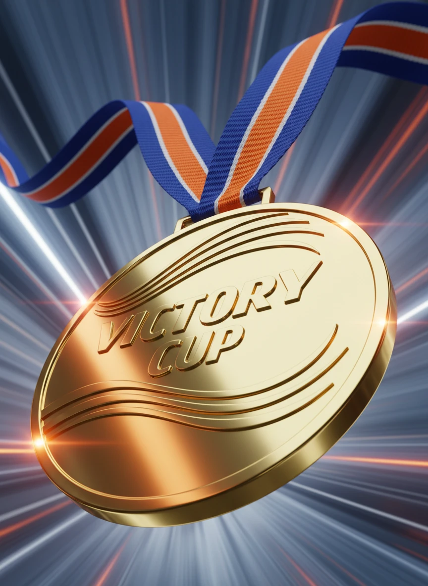 A dynamic sports award medal generated by AI Medal Generator, featuring a bold raised title with motion-inspired engravings. The polished gold finish reflects energetic lighting, paired with a ribbon in team colors. The composition conveys movement and victory. Style tags: sports, dynamic, high-detail. NEG: dull metal, flat composition, unreadable text, low sharpness, artifacts, poor lighting.
