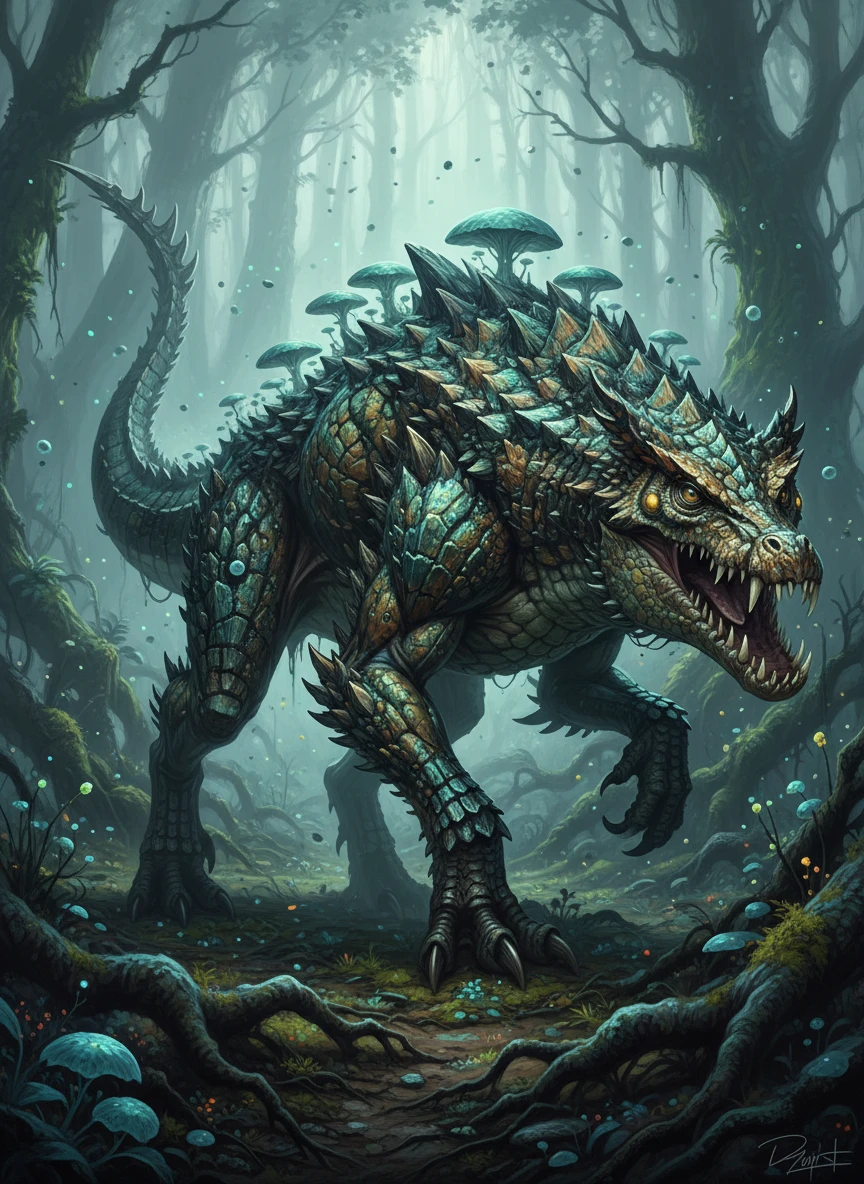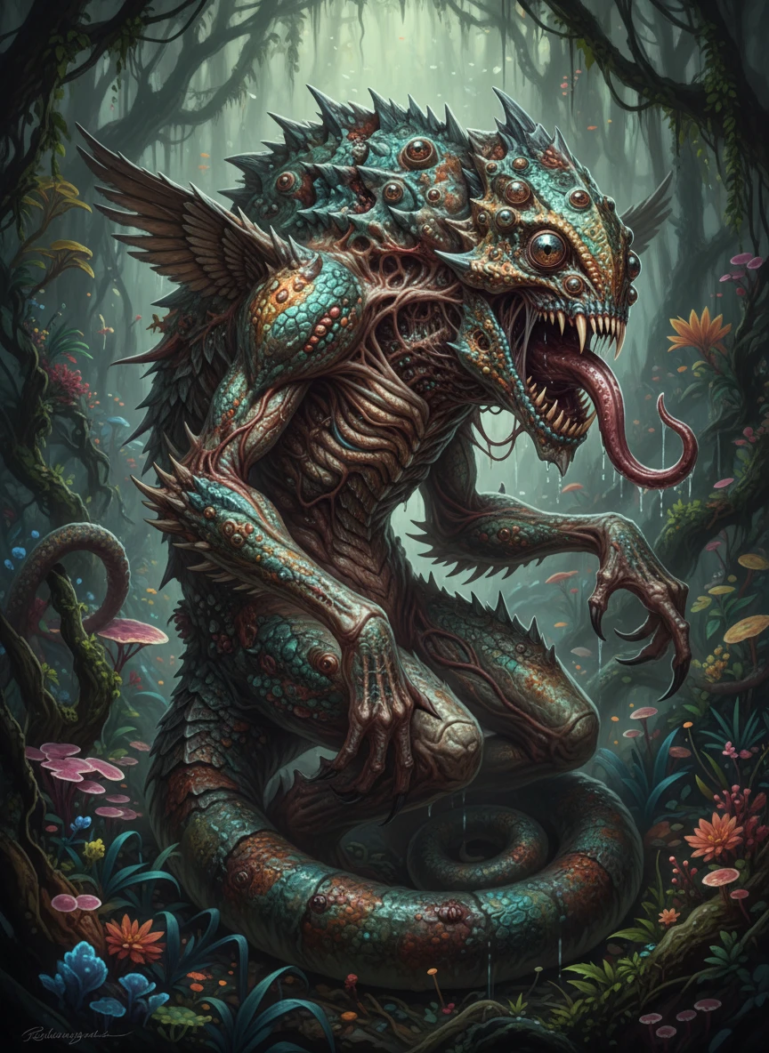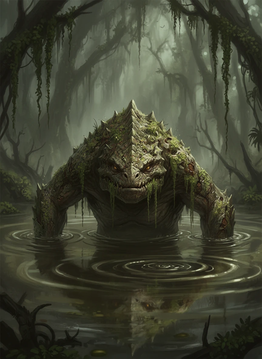 A swamp monster rises from murky water, algae clinging to leathery skin and reptilian eyes half-submerged. Crafted with realistic Monster Generator, the creature appears like an undiscovered amphibious predator. Ripples and reflections add photographic realism. Natural horror, photoreal, moody NEG: clean skin, stylized look, neon colors, symmetry errors, blur, artifacts, text, watermark