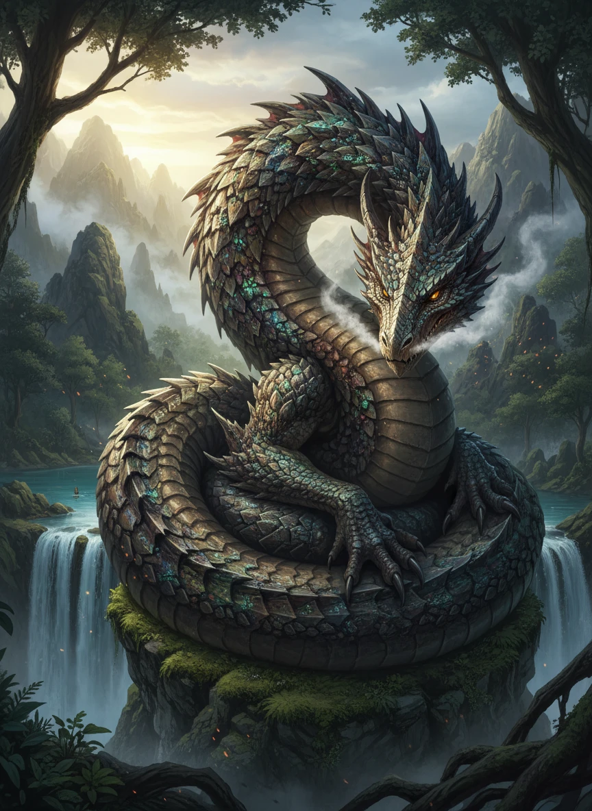 A legendary colossal creature standing against mountains, ultra-detailed scales, realistic skin textures, dynamic lighting highlighting epic scale and volume, cinematic composition, photoreal dark fantasy, hyper-real anatomy, dramatic fog and shadows