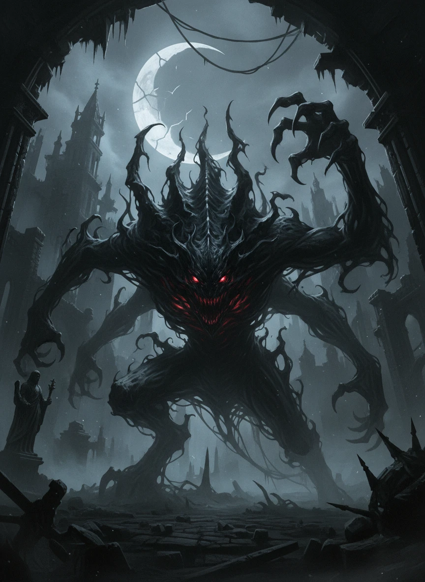A shadowborn monster formed from darkness, intense realism with deep contrast, partially obscured body, glowing eyes cutting through shadows, high dynamic range lighting, photoreal textures, ominous atmosphere, cinematic composition, dark fantasy realism, ultra-detailed surfaces