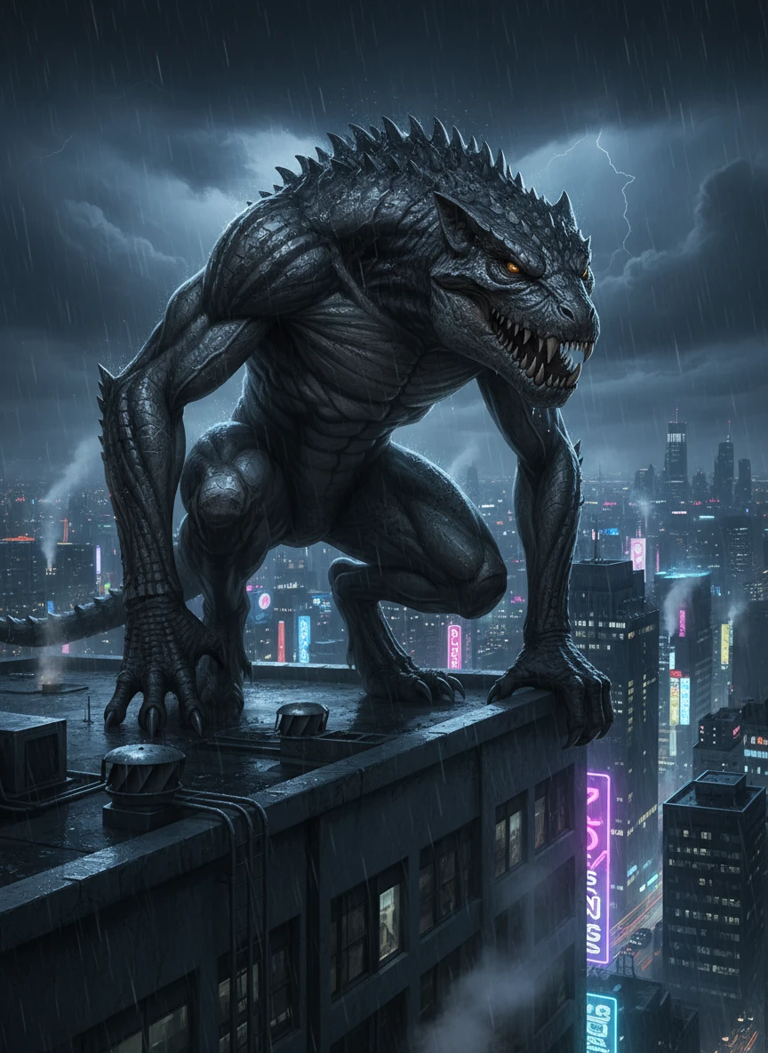 A realistic monster crouches on a city rooftop at night, muscles tense and eyes alert like a real predator. Built with realistic Monster Generator, the anatomy and proportions follow believable biology. Neon reflections and rain add cinematic realism. Urban realism, dark cinematic, photoreal NEG: anime style, exaggerated limbs, smooth textures, blur, oversaturated colors, text, watermark