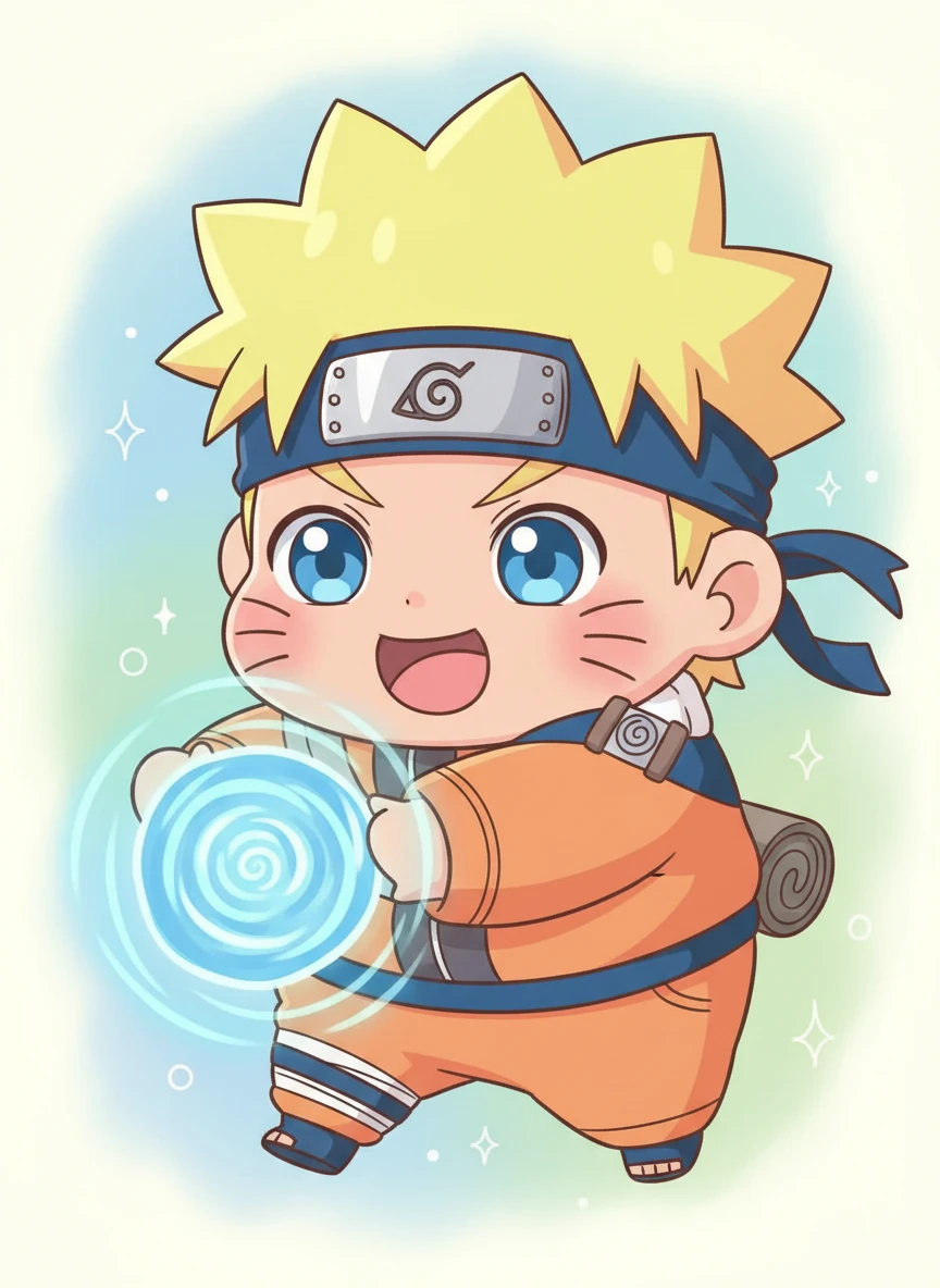 AI Naruto Generator chibi-style depiction of Naruto playfully forming a Rasengan with exaggerated expressions. Simplified shapes, pastel colors, and cute proportions create a lighthearted mood. The character remains instantly recognizable. Style: anime, chibi, cute NEG: realistic textures, harsh shadows, dull palette, distorted face, watermark, text, noise