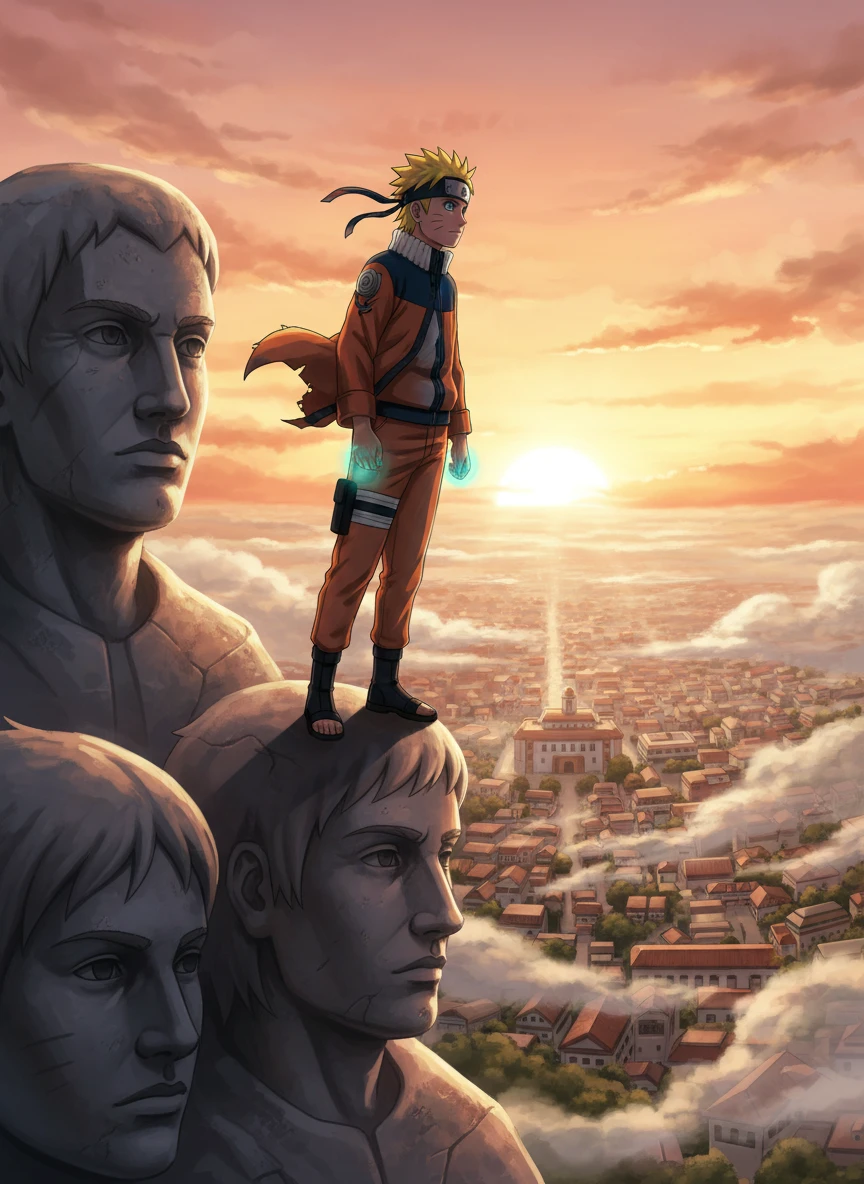 AI Naruto Generator scene of Naruto Uzumaki standing atop the Hokage Monument at sunrise, wind lifting his orange jacket as chakra subtly glows. The Hidden Leaf Village stretches below with painterly clouds and cinematic depth, emphasizing hope and ambition. Dynamic anime lighting highlights determination and youth. Style: anime, cinematic, vibrant NEG: blurry, low-detail, extra limbs, deformed face, watermark, text, logo