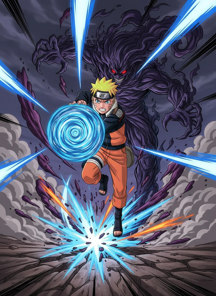 AI Naruto Generator action scene showing Naruto launching a Rasengan mid-air against a shadowy enemy. Motion streaks, shattered ground, and explosive energy convey speed and force. Bold linework and saturated colors amplify combat intensity. Style: anime, action-packed, high-contrast NEG: motion smear, overexposure, missing fingers, bad perspective, cluttered background, watermark, text