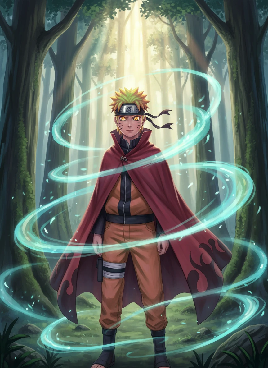 AI Naruto Generator depiction of Naruto in Sage Mode within a misty forest, natural energy swirling as glowing toad markings frame his eyes. The ancient environment feels calm yet powerful with soft god rays through tall trees. Serenity contrasts with intense focus. Style: anime, mystical, dramatic NEG: noise, flat lighting, wrong colors, distorted anatomy, duplicate faces, watermark, artifacts