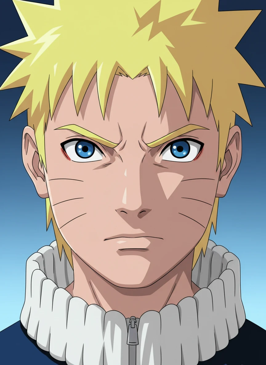 AI Naruto Generator close-up portrait of Naruto against a minimal background, blue eyes intense and focused with clear whisker marks. Clean composition emphasizes iconic features and expression. Sharp highlights and bold shading define the face. Style: anime, portrait, clean NEG: soft focus, washed colors, asymmetry, bad eyes, text overlay, watermark, noise