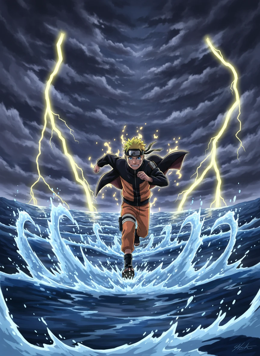 AI Naruto Generator epic wide shot of Naruto running across water, chakra splashing beneath his feet under stormy skies. Lightning silhouettes his form, enhancing speed and resolve. Perspective exaggerates motion and scale. Style: anime, epic, dynamic NEG: perspective errors, pixelation, stiff motion, extra legs, watermark, text, artifacts