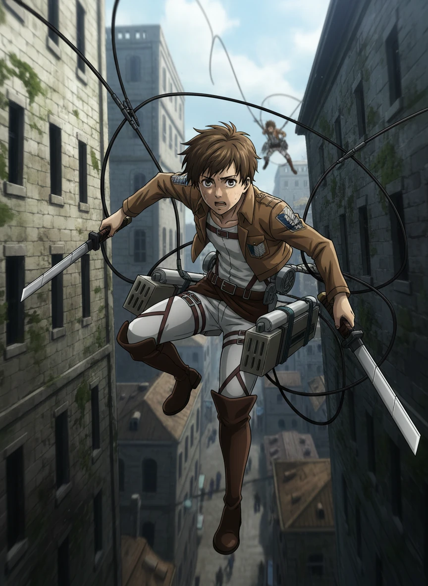 Attack on Titan OC Generator: Illustrate a young cadet during ODM training, suspended midair between towering stone buildings. The character’s face shows fear mixed with resolve, sweat visible under harsh sunlight. Dynamic motion blur and perspective convey speed and risk. action anime, dynamic pose, motion blur, intense — NEG: static pose, blurry face, extra weapons, incorrect gear, flat lighting