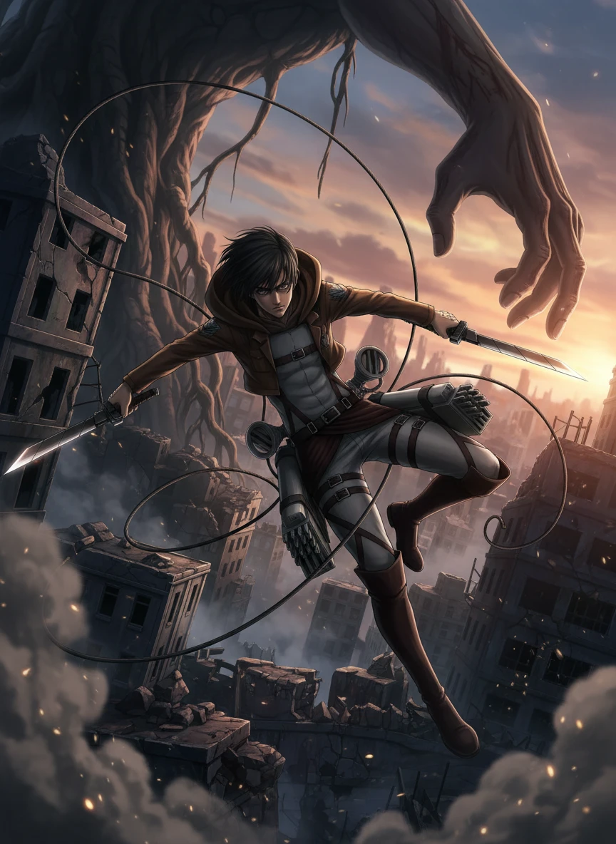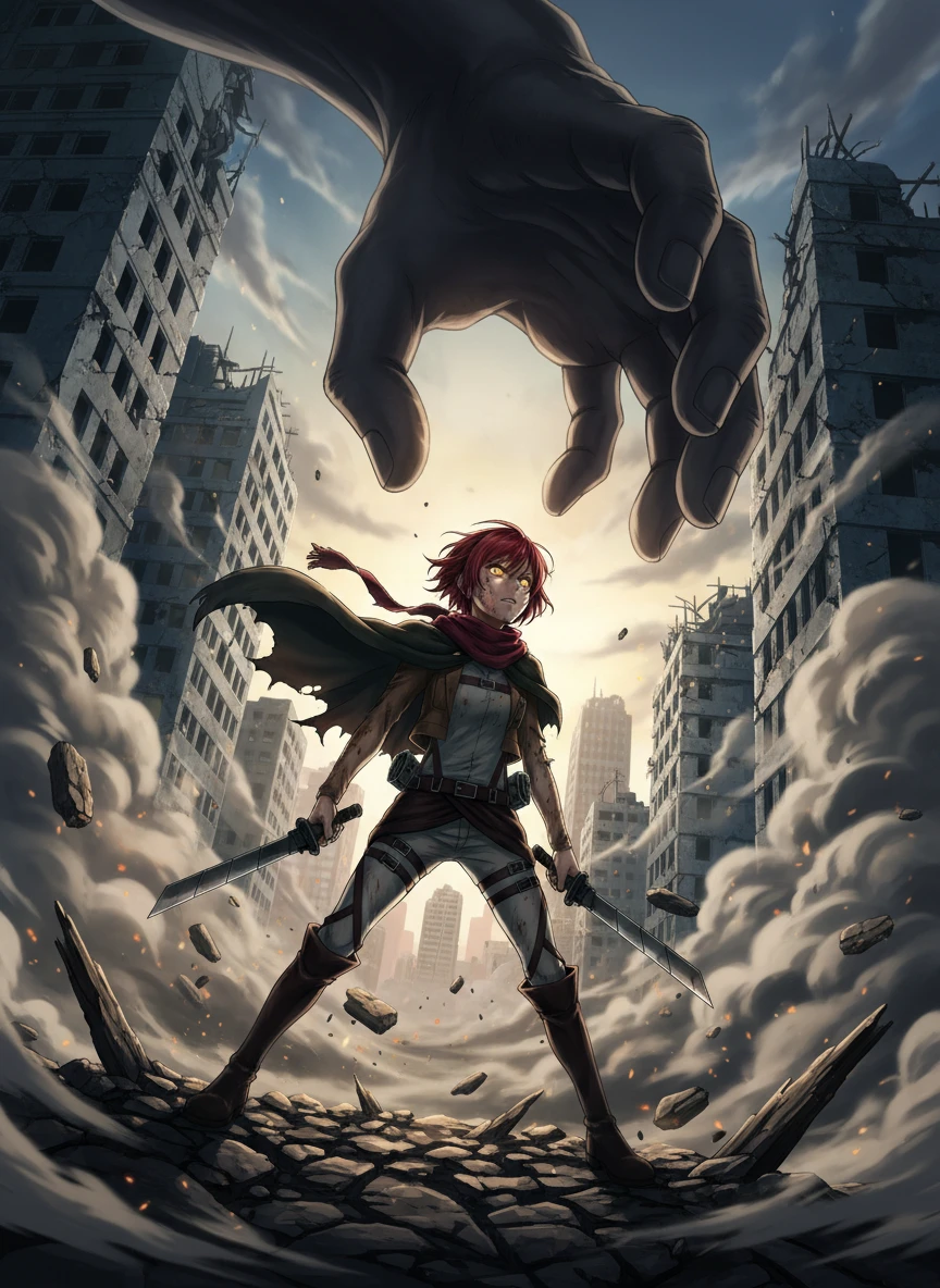 Attack on Titan OC Generator: Illustrate an original character making a last stand against an unseen Titan, blades broken and uniform torn. The pose is defiant, eyes burning with resolve as debris and dust swirl around. Epic scale and dramatic composition define the moment. epic anime, dramatic, high contrast, intense — NEG: happy mood, clean clothes, low drama, soft lighting, incorrect scale