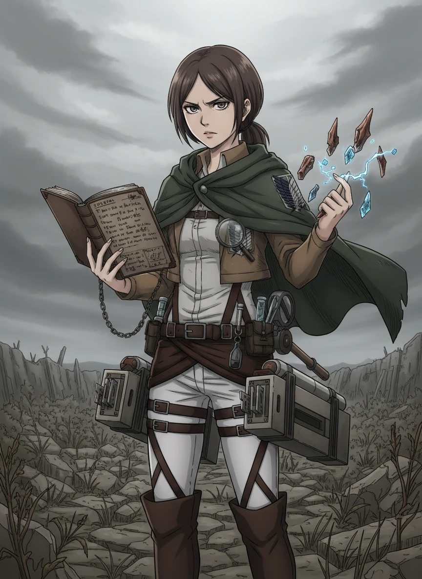 Attack on Titan OC Generator: Portray an original female character from the Survey Corps specializing in Titan research, holding field notes and broken Titan fragments. Her uniform is customized with tools and pouches, expression sharp and analytical. Muted colors and overcast skies give a grounded, serious tone. muted palette, anime style, grounded, detailed — NEG: fantasy armor, bright neon, exaggerated curves, low detail, soft focus