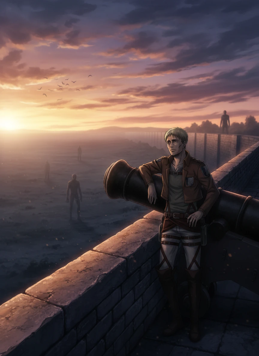 Attack on Titan OC Generator: Create an OC assigned to Wall Garrison duty, leaning against a cannon while watching the horizon at sunset. The mood is calm yet tense, with warm light contrasting looming shadows beyond the wall. Subtle realism keeps the scene grounded in the AoT universe. cinematic anime, warm lighting, atmospheric — NEG: futuristic tech, sci-fi armor, oversaturation, low realism, distorted scale
