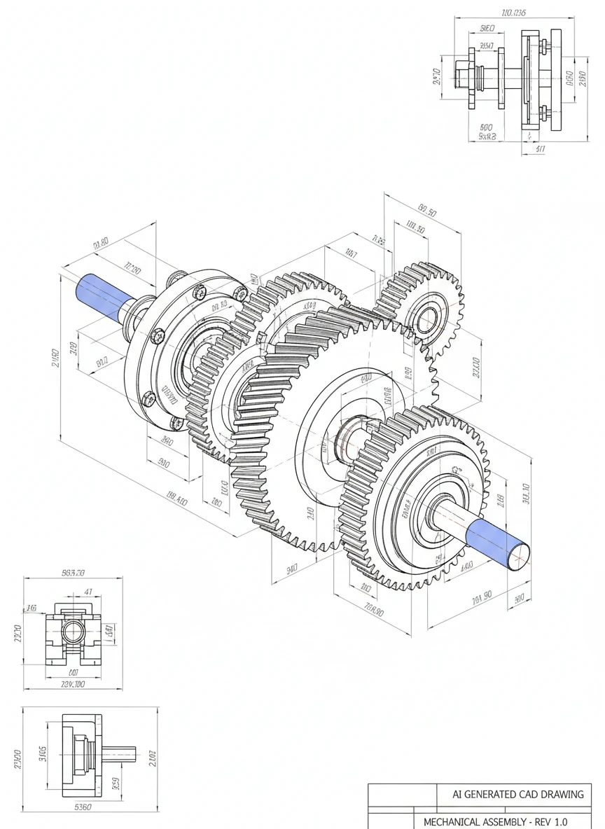 Generate an AI CAD Drawing Generator of a complex mechanical gear assembly, showing all interlocking components in clear 3D orthographic projection. Highlight every bolt, shaft, and cog with precision lines and technical dimensions. Use minimal color to maintain professional engineering clarity. Style-tags: mechanical, precision, engineering, technical NEG: sketchy, cartoonish, hand-drawn, smudged, low-detail, abstract, distorted