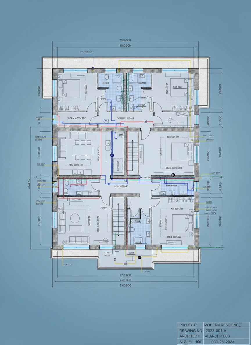 Produce an AI CAD Drawing Generator of a modern residential house blueprint, including multiple floor levels, structural beams, and window placements. Focus on exact measurements, proportionate layouts, and detailed annotations for plumbing and electrical routes. Render with crisp lines and a professional drafting style. Style-tags: architectural, residential, blueprint, technical NEG: messy, blurry, abstract, cartoon, exaggerated, warped, low-res
