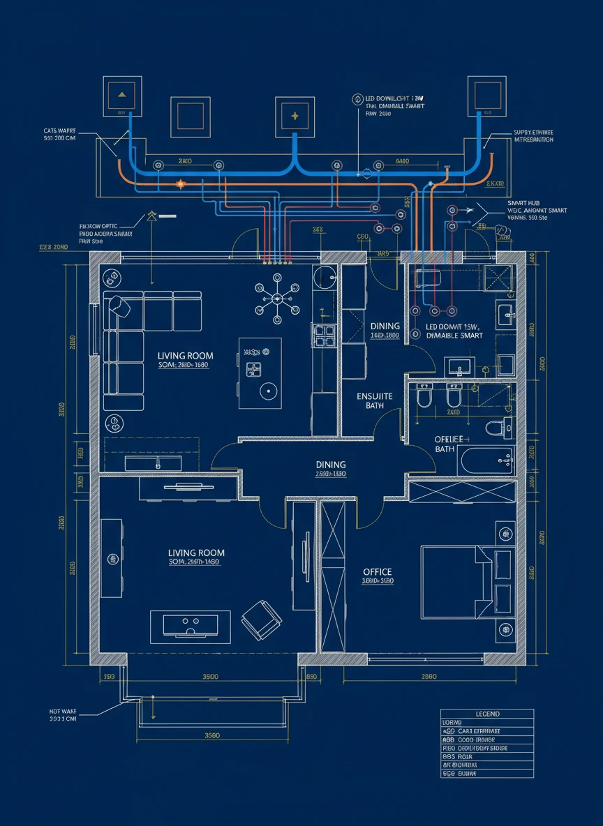 Generate an AI CAD Drawing Generator of a smart home interior layout, showing furniture, wiring, HVAC ducts, and lighting plans. Include measurements, room labels, and detailed annotations for electrical and plumbing integration. Emphasize clarity and practical design in professional CAD style. Style-tags: architectural, interior, technical, schematic NEG: messy, cartoon, abstract, low-res, blurry, warped