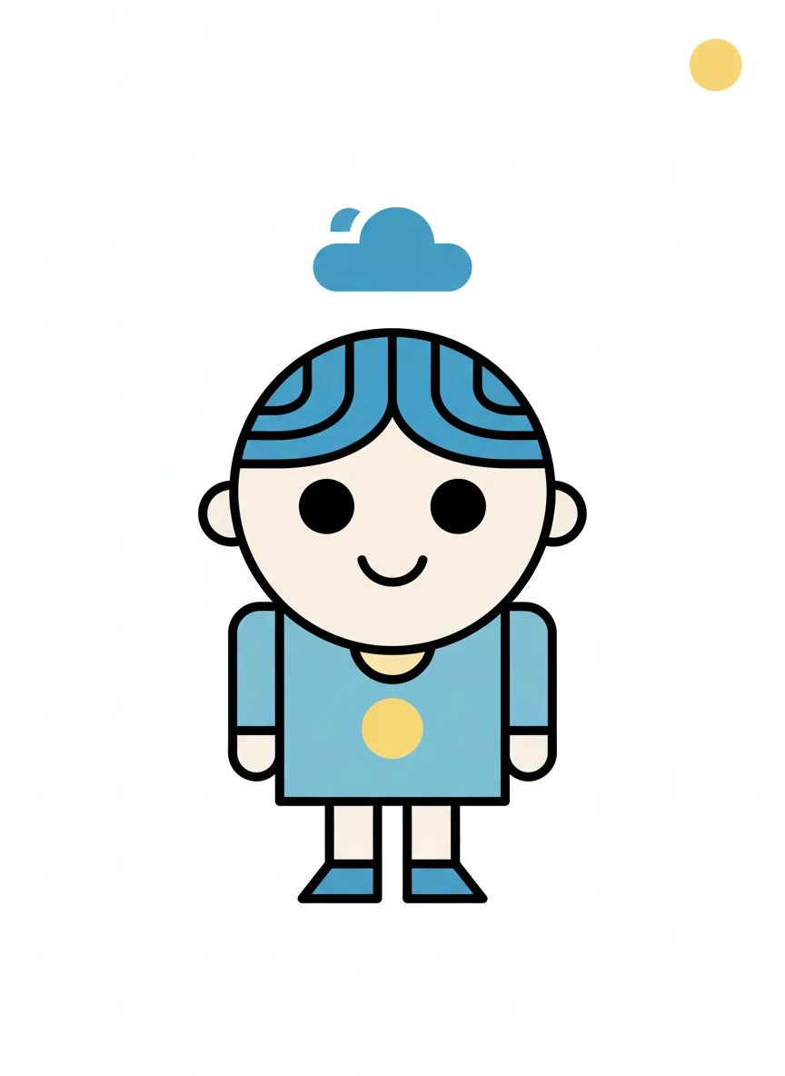 A modern flat-design cartoon character generator prompt showing a clean, minimal character suitable for apps or branding. The character uses geometric shapes, limited colors, and a neutral pose. The style is simple yet expressive. Style: flat cartoon, minimal design, vector style, modern NEG: gradients, realistic lighting, texture noise, sketch lines, 3D depth
