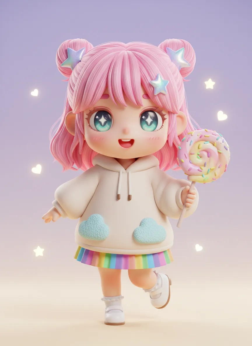 Generate a random cute 3D character in a stylized, big-headed chibi anime style. Each character varies in gender, hair color, outfit, and personality but keeps the 1:3 proportion. Render in ultra-realistic 3D with bright studio lighting, smooth materials, and soft shadows. Faces are highly expressive with oversized sparkling eyes and simplified features. Background: minimal, softly lit. Mood: playful, colorful, and kawaii-inspired.