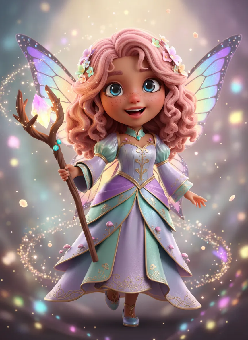 Generate a random cute 3D character in a stylized, big-headed design with a whimsical fantasy theme. Characters may have magical accessories like wands, fairy wings, or glowing elements. Each character varies in gender, skin tone, hairstyle, and outfit while keeping the 1:3 head-to-body ratio. Render in ultra-realistic 3D with soft magical lighting, subtle sparkles, and smooth textures. Faces are expressive with large sparkling eyes and charming features. Background: minimal with soft glowing particles. Mood: enchanting, playful, and fantastical.