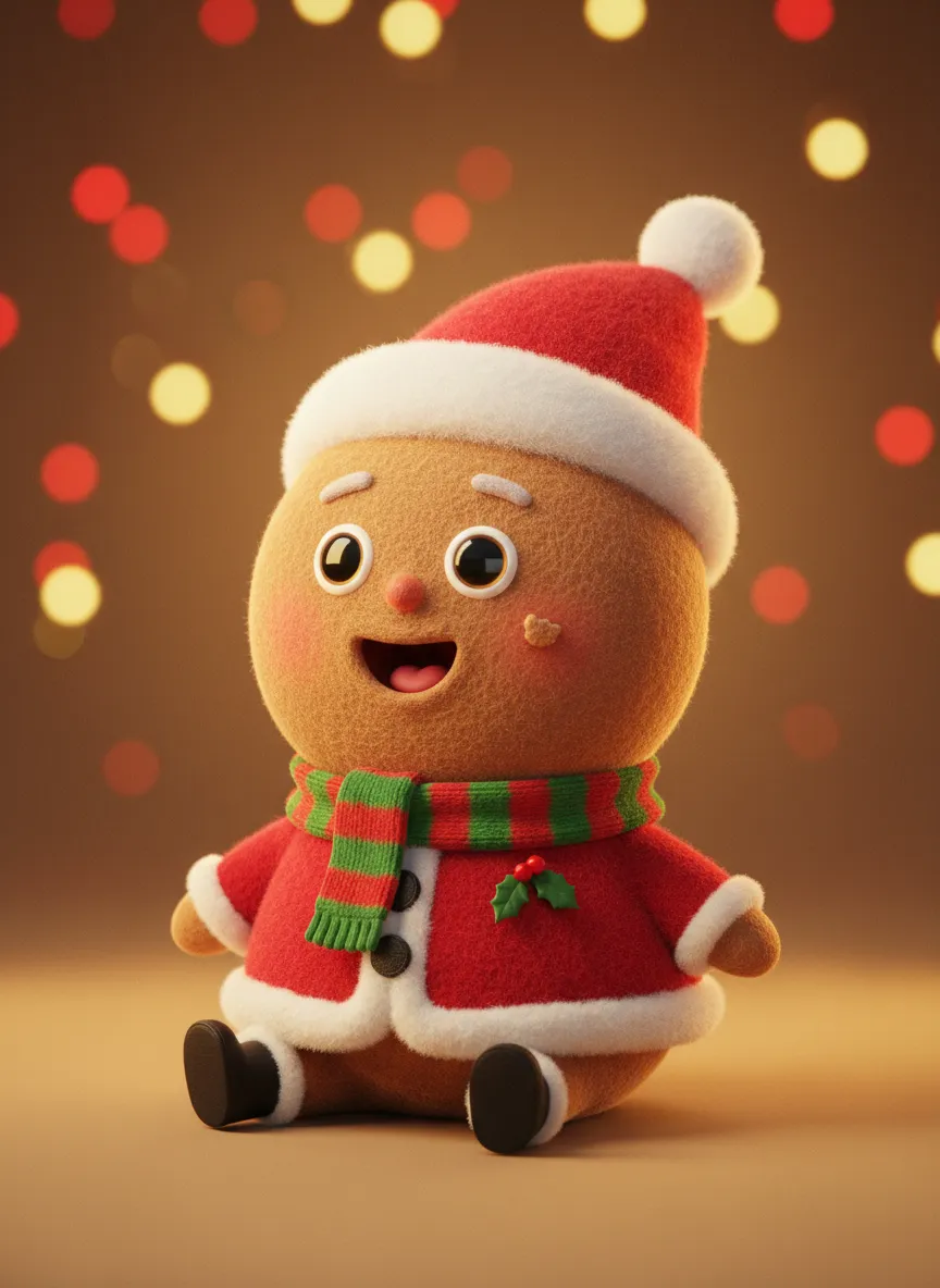 Generate a random cute 3D character in a stylized, big-headed design with a holiday or festive theme. Characters may wear Santa outfits, winter scarves, or seasonal accessories while maintaining 1:3 head-to-body proportions. Render in ultra-realistic 3D with warm studio lighting, smooth textures, and soft shadows. Faces are cheerful and expressive with large eyes. Background: minimal with soft festive glow. Mood: cozy, joyful, and adorable.