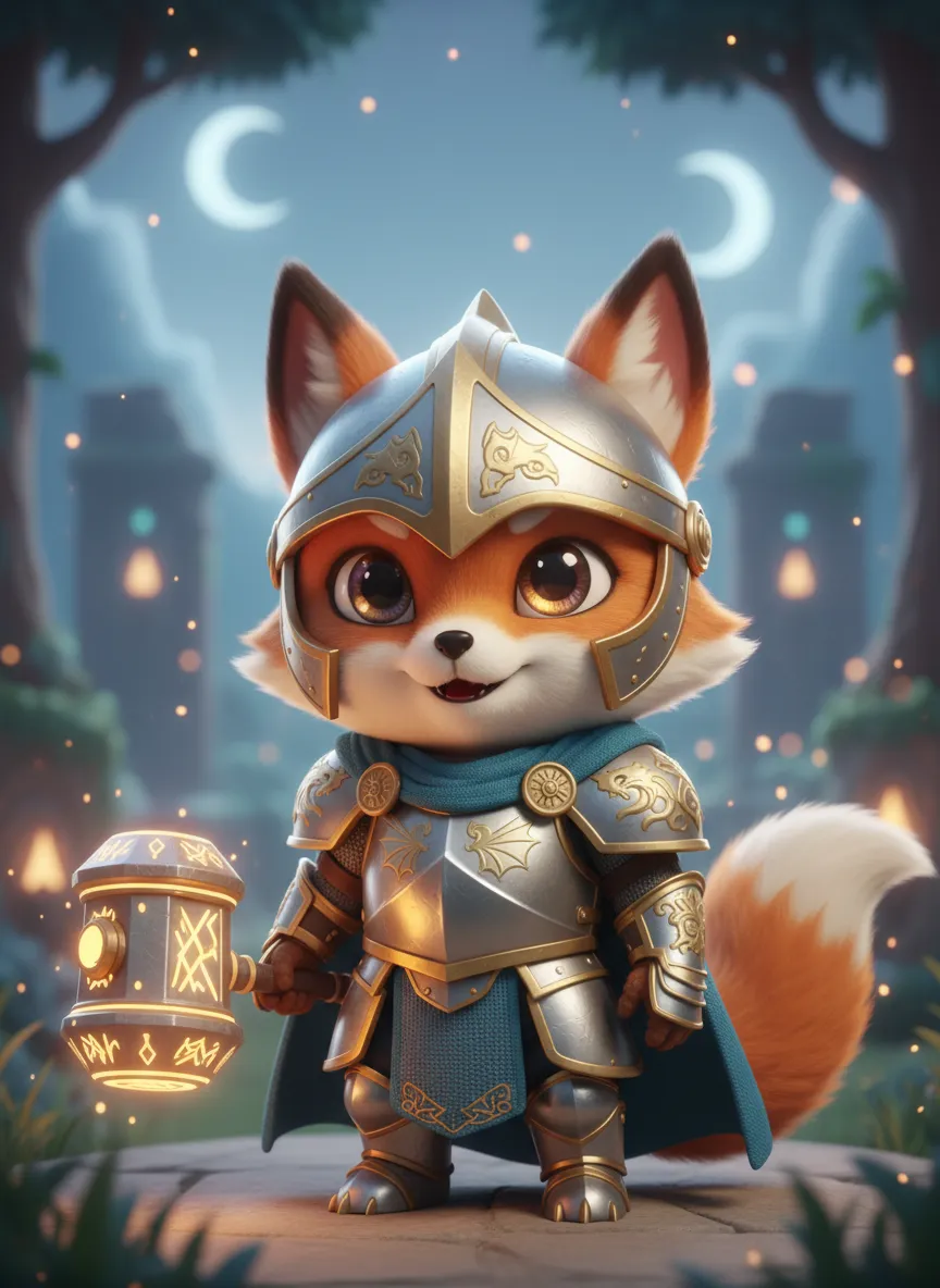 Generate a random cute 3D character in a stylized, big-headed design with medieval or fantasy warrior elements. Characters may wear armor, capes, or medieval outfits while keeping the 1:3 proportion. Render in ultra-realistic 3D with soft cinematic lighting, polished materials, and gentle shadows. Faces are expressive with large detailed eyes and small nose. Background: minimal or softly lit fantasy backdrop. Mood: heroic, cute, and adventurous.