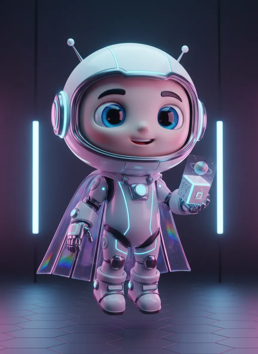 Generate a random cute 3D character in a stylized, big-headed design with a futuristic sci-fi aesthetic. Characters may wear sleek space suits, robotic accessories, or holographic gear. Maintain large-head-small-body proportions (1:3). Render in ultra-realistic 3D with neon highlights, metallic textures, and soft cinematic lighting. Faces are expressive with friendly, charming features. Background: minimal with subtle sci-fi glow. Mood: futuristic, playful, and high-tech cute.