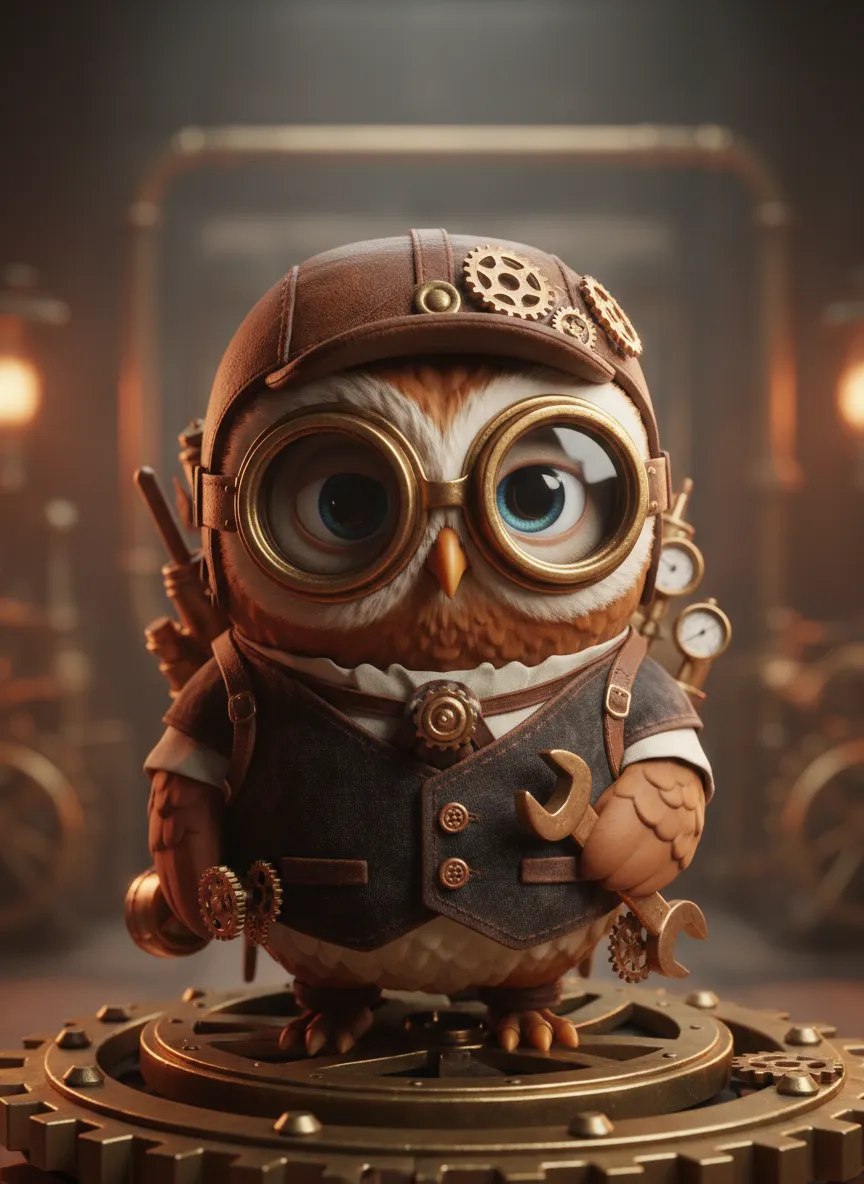Generate a random cute 3D character in a stylized, big-headed design with a steampunk theme. Characters may wear goggles, gears, and Victorian-inspired outfits. Maintain the 1:3 head-to-body ratio. Render in ultra-realistic 3D with warm studio lighting, smooth metallic textures, and soft shadows. Faces are charming with expressive eyes and simplified features. Background: minimal or softly industrial-lit. Mood: adventurous, whimsical, and playful.