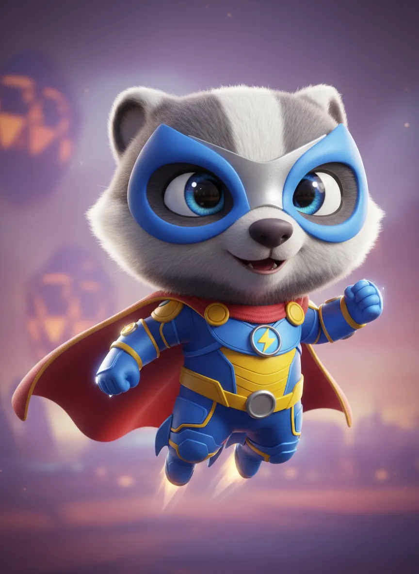 Generate a random cute 3D character in a stylized, big-headed design with a superhero or action theme. Characters may have capes, masks, or action-inspired costumes while keeping the 1:3 proportion. Render in ultra-realistic 3D with dynamic lighting, smooth materials, and subtle shadows. Faces are charming and expressive with big detailed eyes. Background: minimal or softly lit. Mood: playful, heroic, and vibrant.
