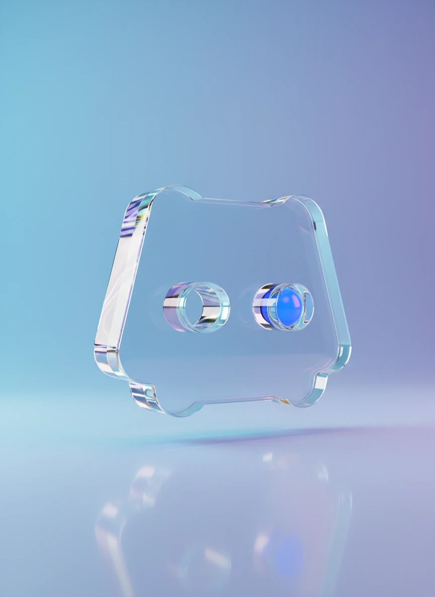 A crystal-clear emblem made with a Realistic Discord logo generator approach featuring a transparent glass mascot icon. Light refracts through the edges, creating realistic reflections and rainbow highlights on a clean gradient background. The composition feels modern and tech-focused with high-quality studio rendering. Style: glass material, 3D render, reflections, modern — NEG: cloudy texture, dull lighting, distortion, blur, watermark, noisy background, jagged edges