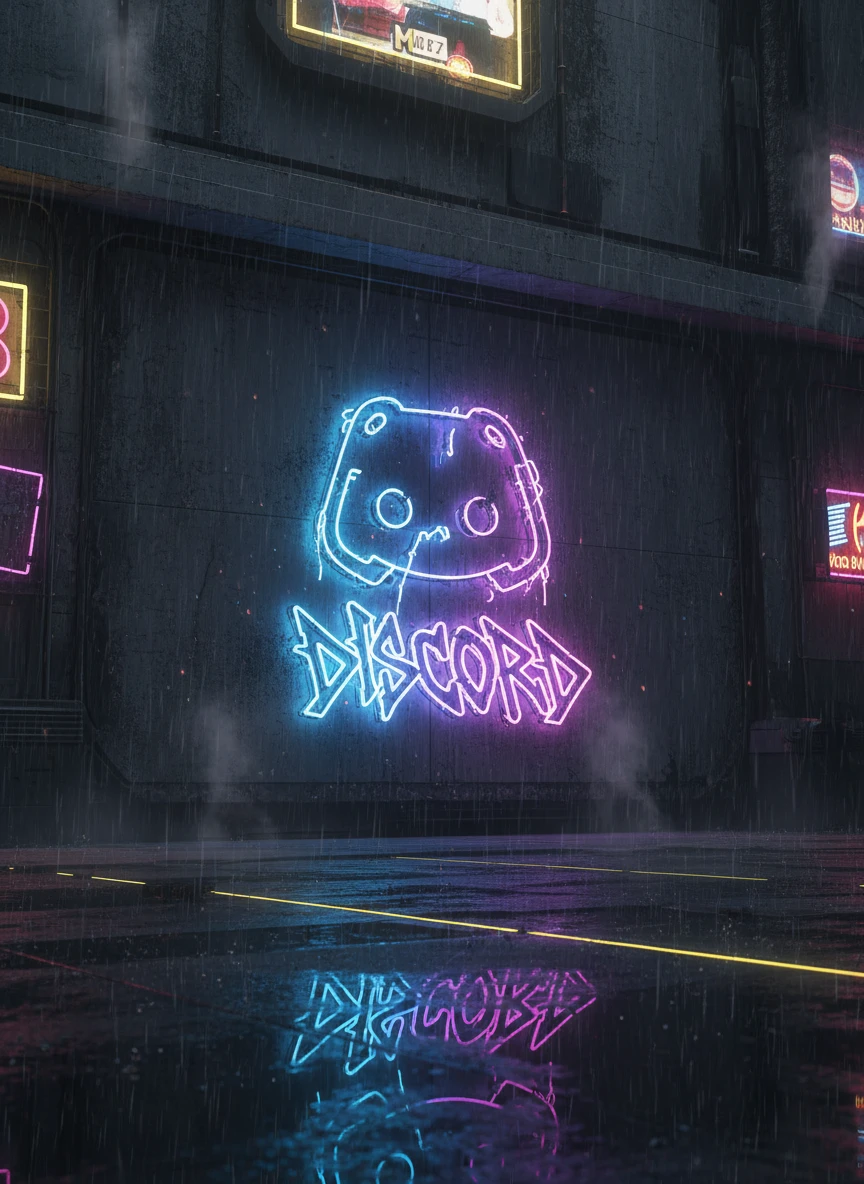 A gritty urban emblem generated with a Realistic Discord logo generator style, featuring the mascot icon as a glowing graffiti-style sign on a futuristic city wall. Neon lights, rain reflections, and subtle steam create a cinematic cyberpunk environment. The logo appears realistic with depth, glowing outlines, and atmospheric lighting. Style: cyberpunk street, neon graffiti, cinematic lighting, urban — NEG: flat colors, washed out lighting, blur, low resolution, watermark, cartoon shapes, messy composition