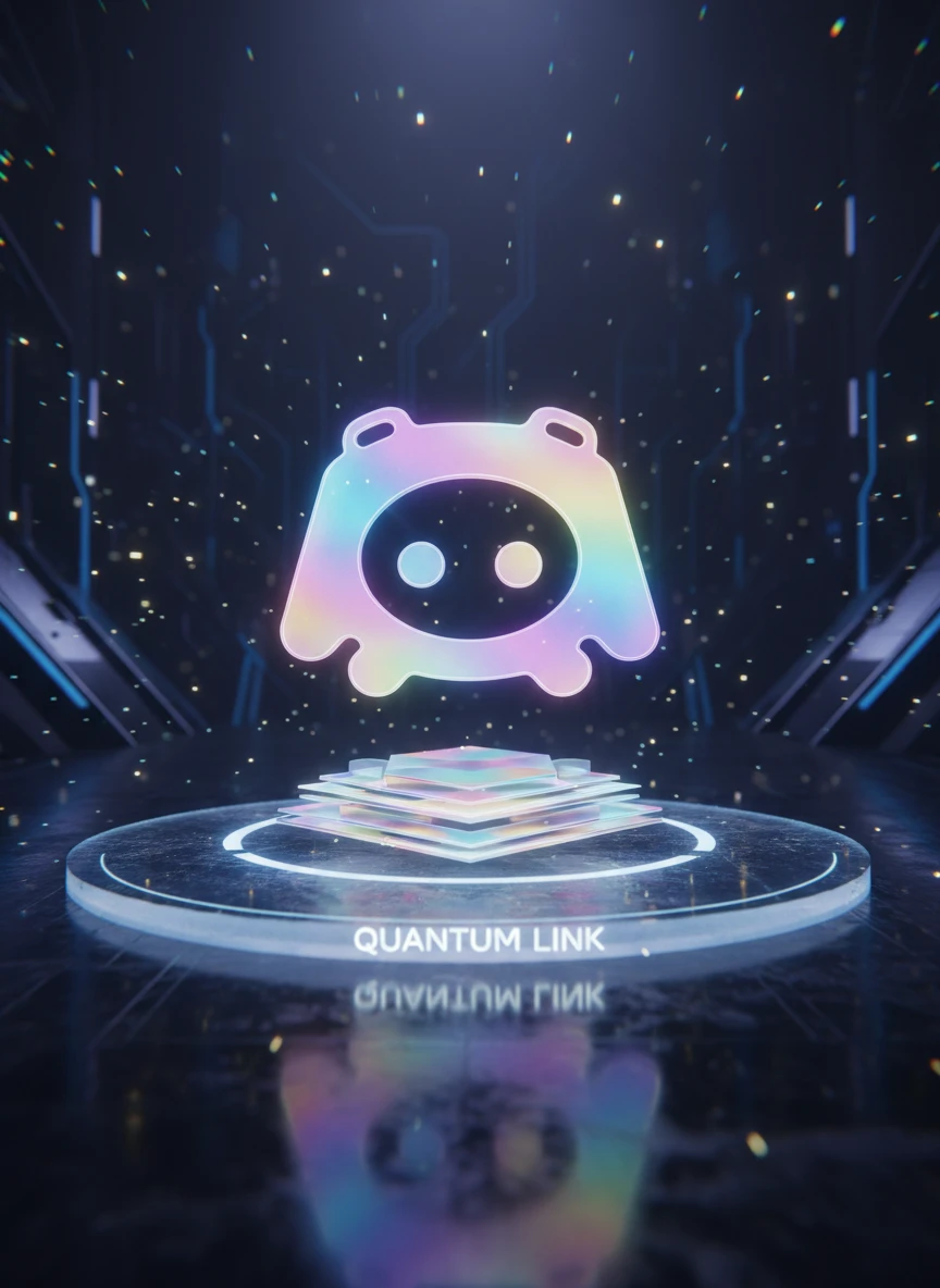 A futuristic holographic emblem inspired by a Realistic Discord logo generator, displaying a glowing translucent mascot icon floating above a glass platform. Rainbow holographic reflections shift across the surface while soft digital particles float in the background. The scene has cinematic lighting with high-tech sci-fi atmosphere and smooth reflections. Style: holographic, futuristic, glass effect, cinematic — NEG: dull colors, flat lighting, blur, low resolution, broken symmetry, watermark, artifacts