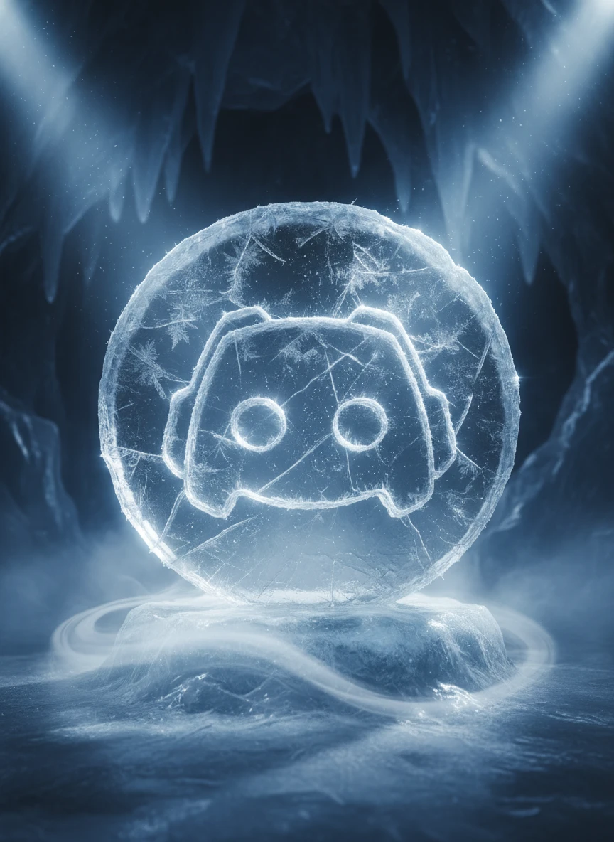 A frozen emblem created with a Realistic Discord logo generator style where the mascot icon is sculpted from translucent ice. Frost particles, cold mist, and cool blue lighting make the logo appear crisp and extremely realistic. Light reflects through the icy edges creating a dramatic winter aesthetic. Style: ice texture, cold lighting, ultra realistic, cinematic — NEG: melted shapes, blur, muddy colors, watermark, pixelation, plastic look, soft focus