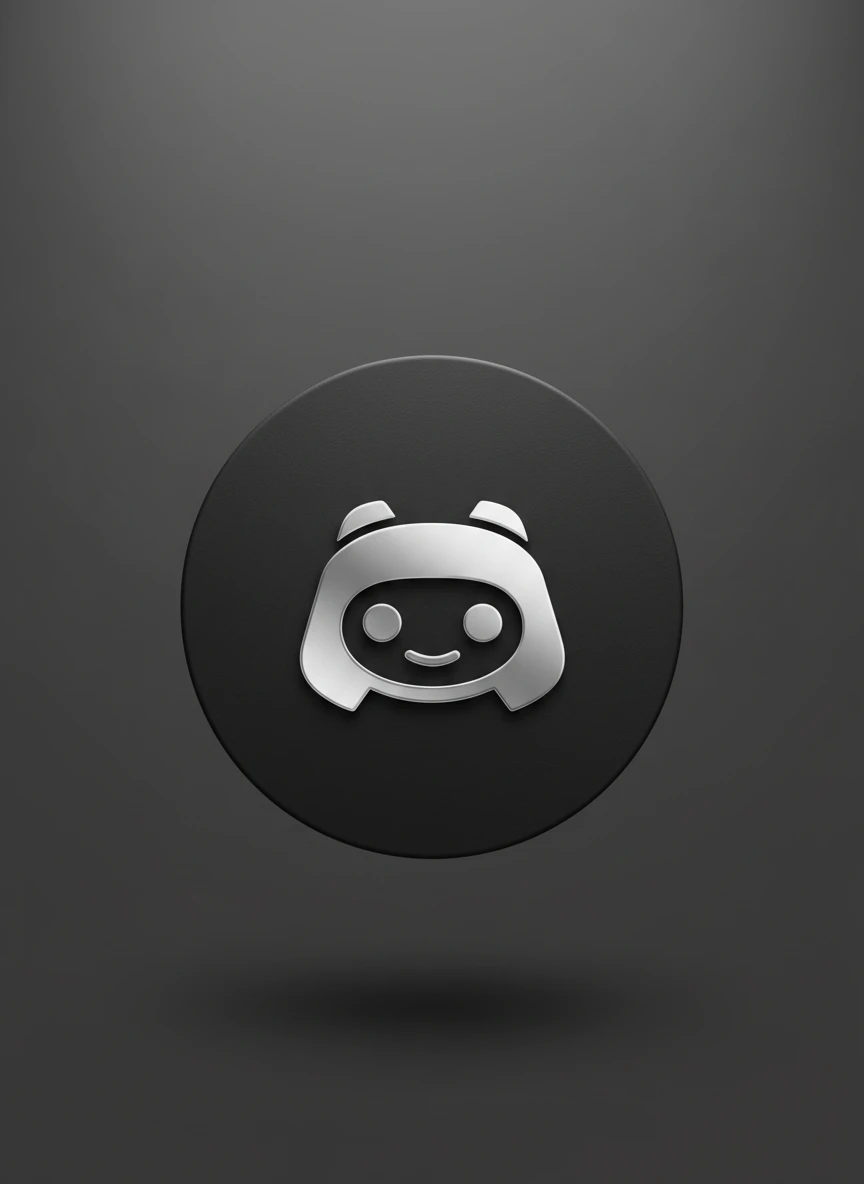 A premium minimalist logo created through a Realistic Discord logo generator idea, showcasing a sleek silver mascot icon engraved on a matte black circular badge. Soft studio lighting highlights the clean contours and smooth reflective material, creating a modern luxury brand aesthetic. The composition is centered with balanced shadows and subtle depth. Style: minimalist, luxury branding, clean design, studio lighting — NEG: cluttered background, rough edges, pixelated, bright neon colors, watermark, low quality, overexposed