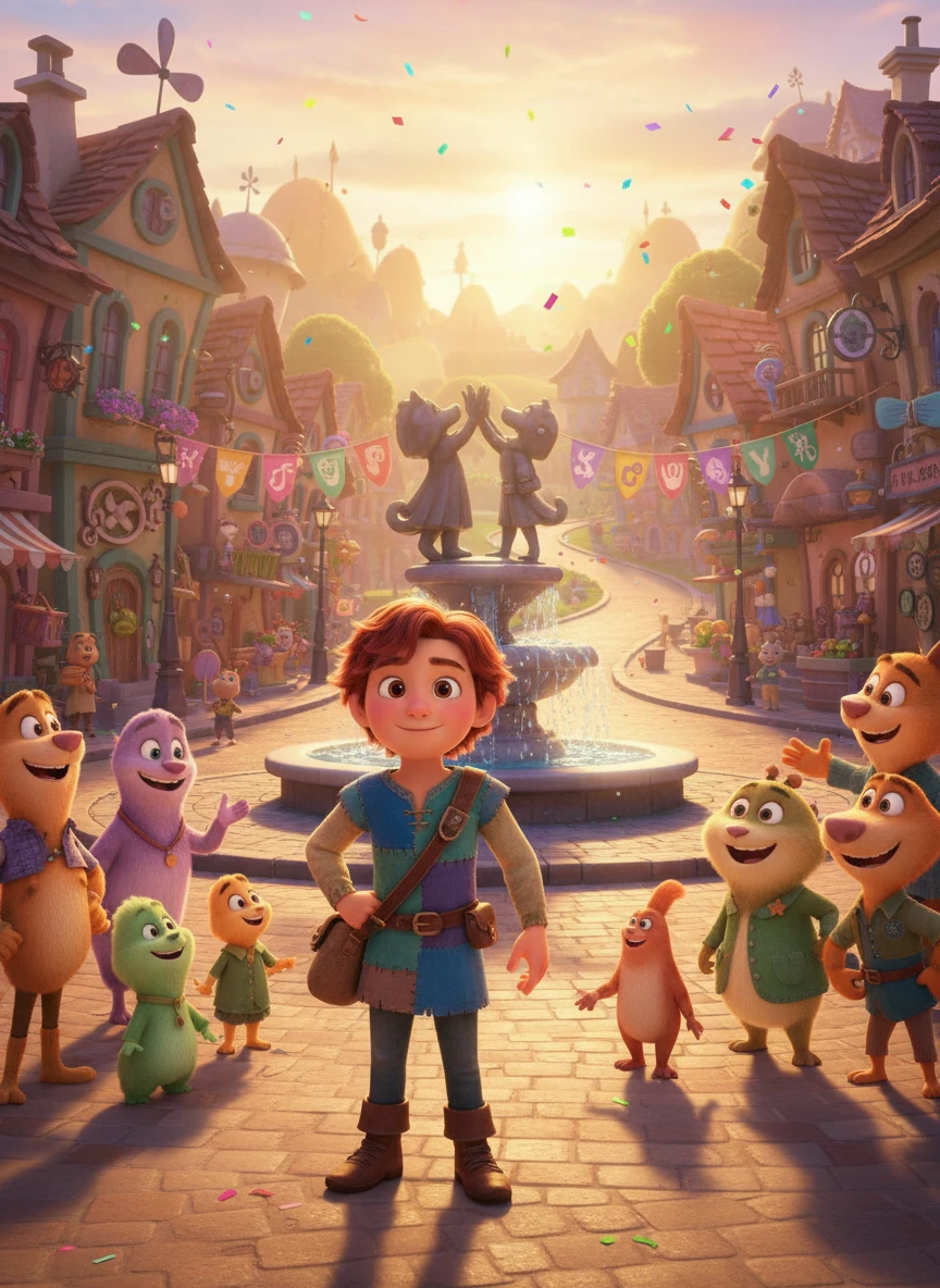 Cheerful Small-Town Hero. A bright, heartwarming character scene in a disney-pixar generator style showing a young hero standing in a colorful animated town square, expressive eyes and soft rounded features. The lighting is warm and optimistic, with pastel buildings and playful details that suggest friendship and adventure. The composition feels cinematic yet cozy, like a movie still from an animated film. Style: disney-pixar generator, cinematic animation, vibrant colors, soft lighting NEG: realistic skin texture, harsh shadows, dark horror tones, hyper-detailed pores, gritty realism, text artifacts