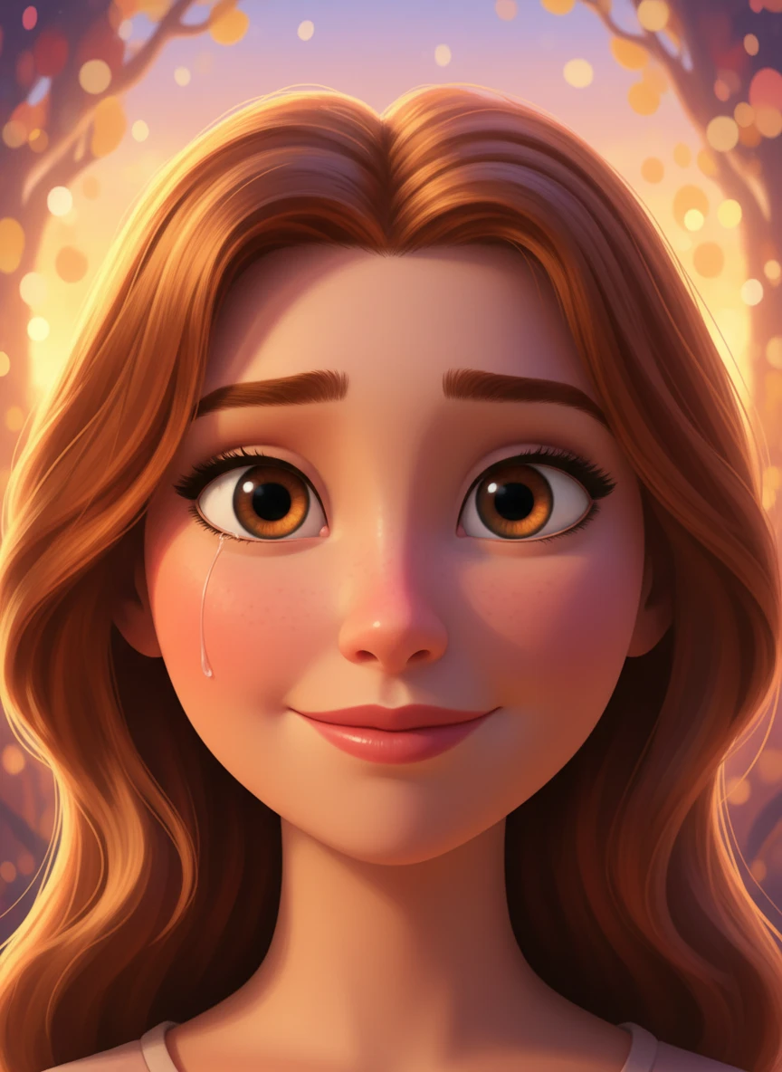 Emotional Close-Up Portrait. A close-up character portrait in a disney-pixar generator style, focusing on expressive eyes and subtle emotions. The face is softly lit with smooth skin, simplified textures, and a colorful blurred background. The overall feeling is heartfelt and cinematic, like a key emotional moment in an animated film. Style: disney-pixar generator, animated portrait, soft shading, cinematic NEG: hyper-real wrinkles, rough skin, photographic lighting, uncanny realism, grain, distortion