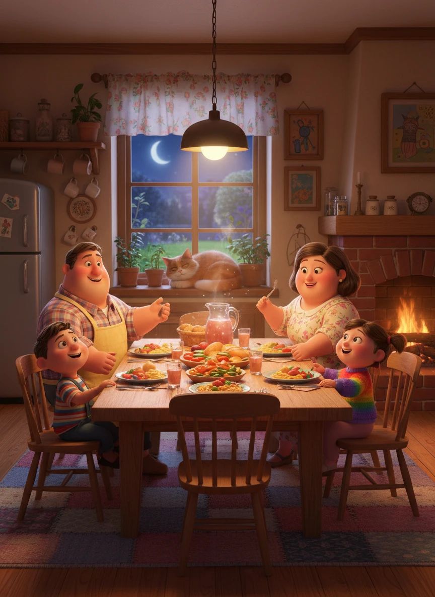 Family Slice-of-Life Scene. A warm domestic moment illustrated in a disney-pixar generator aesthetic, showing an animated family sharing a meal in a cozy kitchen. Characters have rounded proportions, lively expressions, and colorful clothing. The environment is detailed but playful, emphasizing comfort and emotional connection. Style: disney-pixar generator, family animation, warm colors, cozy NEG: realistic proportions, dull lighting, cluttered background, sadness, harsh contrast, noise