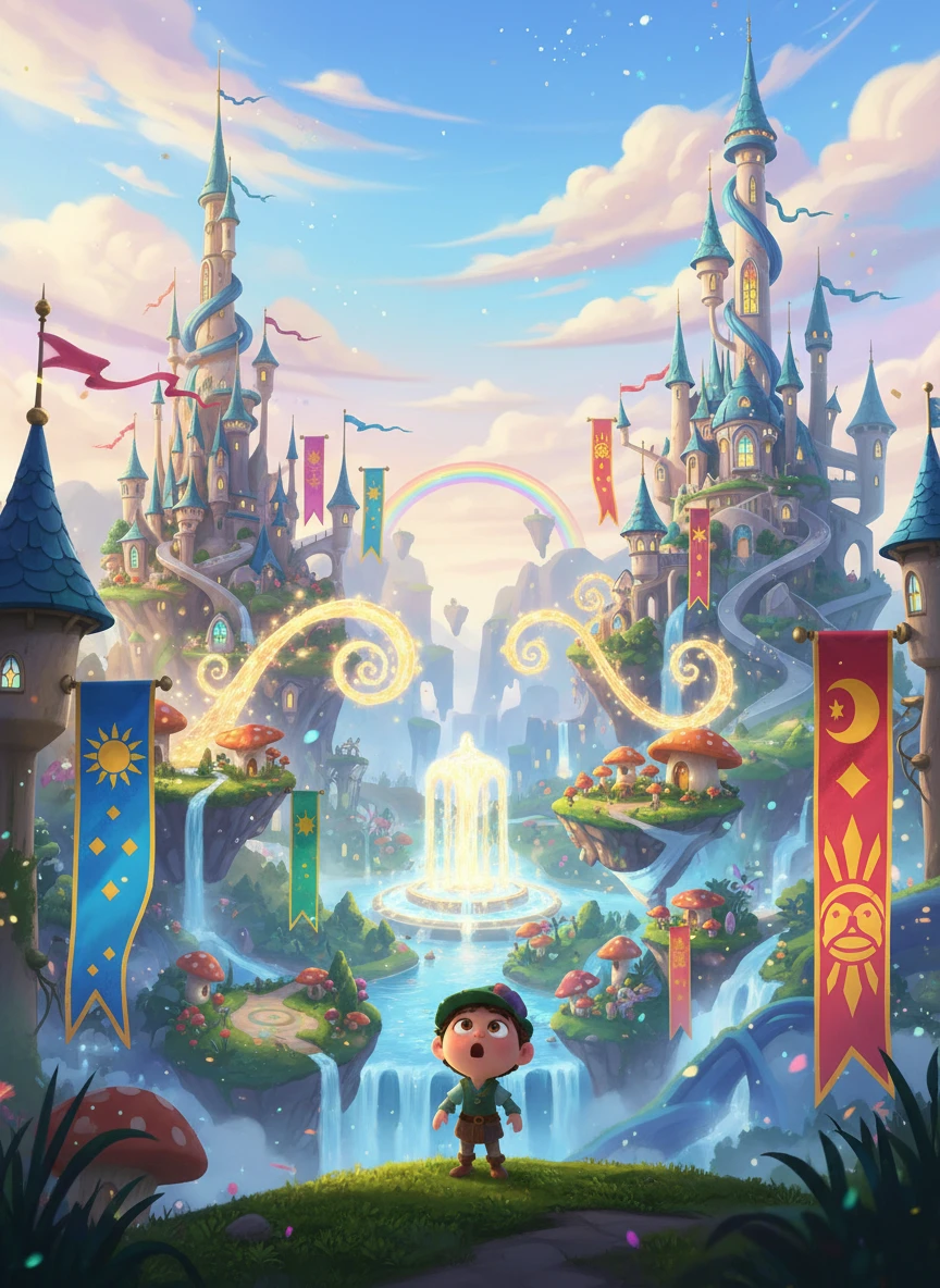 Fantasy Kingdom Arrival. A wide establishing shot in a disney-pixar generator style of a whimsical animated kingdom with tall towers, floating elements, and bright banners. A small character stands in the foreground looking up in awe, enhancing a sense of scale and wonder. The colors are vibrant and the atmosphere is uplifting and magical. Style: disney-pixar generator, animated fantasy, epic yet playful, colorful NEG: dark medieval realism, muted palette, photoreal textures, fog overload, blur, low detail